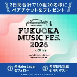 ハイアールジャパンセールス株式会社(本社:大阪市、代表取締役社長:杜 鏡国)は、2026年1月24日(土)・25日(日)にみずほPayPayドーム福岡で開催される音楽フェス「FUKUOKA MUSIC FES.2026 supported by Olive 」に協賛いたします。 これに伴い、本日2025年12月27日(土)より、本イベントのペアチケット(引換券)が当たる「FUKUOKA MUSIC FES.2026 supported by Olive ペアチケットプレゼントキャンペーン」を公式X(旧Twitter)にて開催いたします。