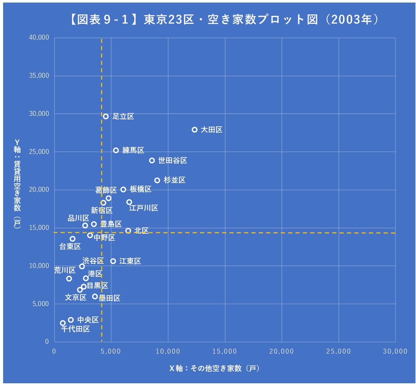 そこで、空き家増加の実態をよりみえやすくするため、X軸をその他空き家、Y軸を賃貸用の空き家の実数とする2003年・2023年のプロット図を描いて比較してみると、多くの区で「その他空き家」、「賃貸用の空き家」とも増加している状況がみてとれますが、とくに世田谷区・足立区・板橋区・大田区・練馬区では「その他空き家」「賃貸用の空き家」の両方が、江戸川区・台東区・江東区では「その他空き家」が、新宿区・豊島区・杉並区・中野区・葛飾区で は「賃貸用の空き家」の実数が、特別区部平均値を超えて増えてきていることが分かります【図表9-1、9-2】。