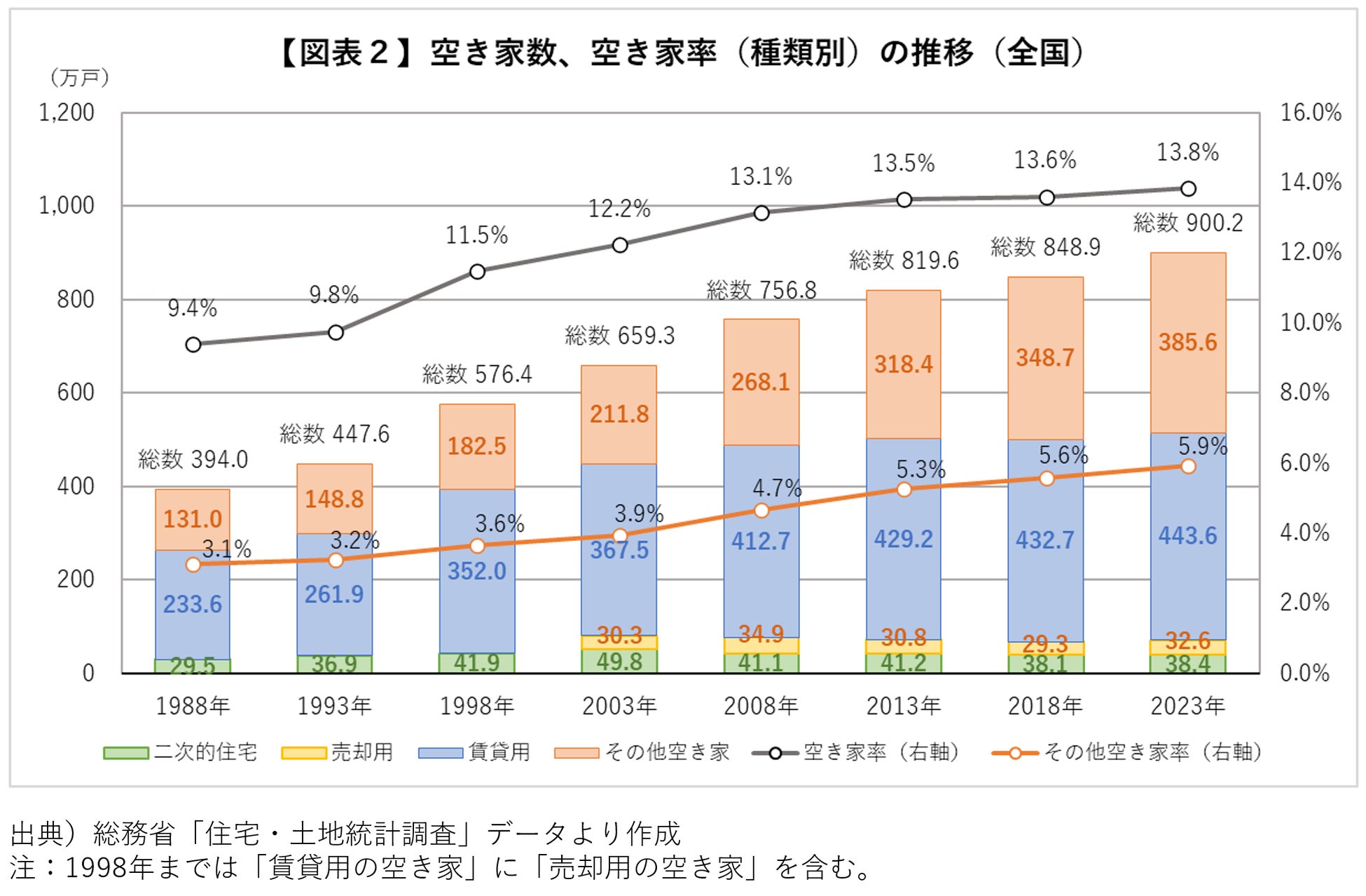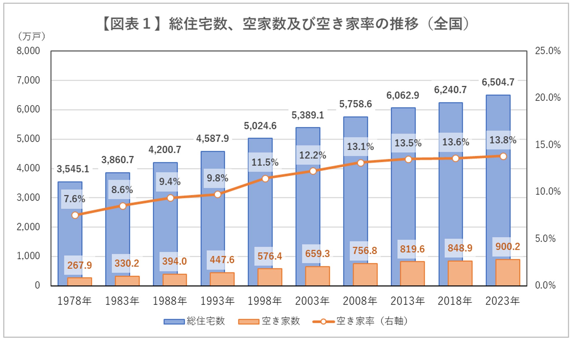 はじめに全国の動向をみると、2023年の総住宅数は6504.7万戸であり、2018年と比べて264万戸増加(4.2%増)しています。その一方、空き家数は900.2万戸と、2018年と比べて51.3万戸増加(6.0%増)し、空き家率は13.8%(0.2ポイント上昇)となっています。空き家数はこれまで一貫して増加が続いており、1993年(447.6万戸)から2023年(900.2万戸)の30年間で約2倍に増え、空き家率も9.8%から13.8%へと着々と上昇しています【図表1】。