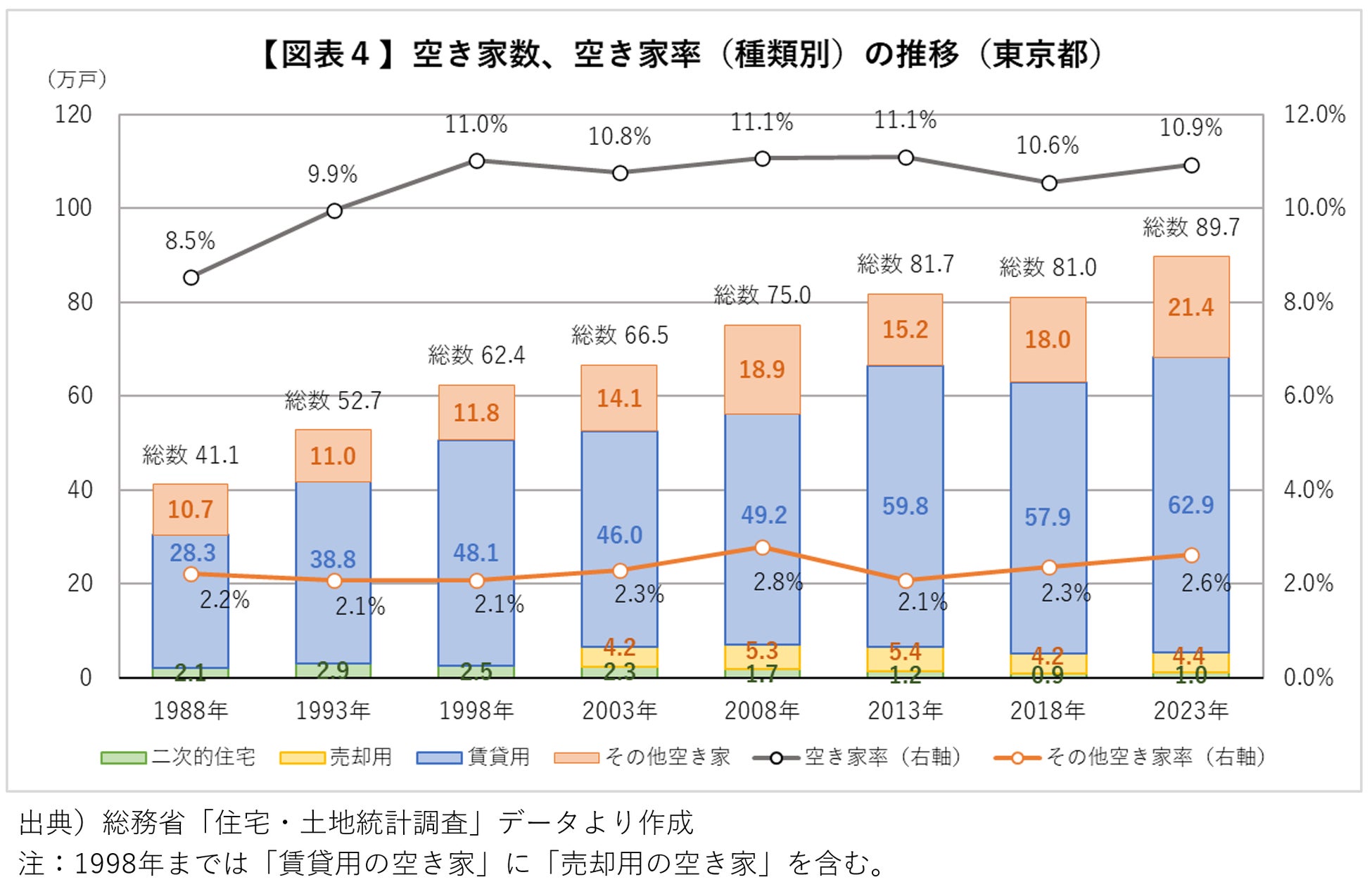 東京都における2023年の総住宅数は820.1万戸であり、2018年と比べて53.0万戸(6.9%)増加しています。空き家数は89.7万戸と、2018年と比べて8.7万戸(10.7%)増加し、空き家率は10.9%(0.3ポイント上昇)となっています。全国の空き家率が一貫して上昇しているのに対して、東京都ではほぼ横ばいとなっており、ここ15年間は全国の空き家率を下回る水準で推移しています【図表4】。