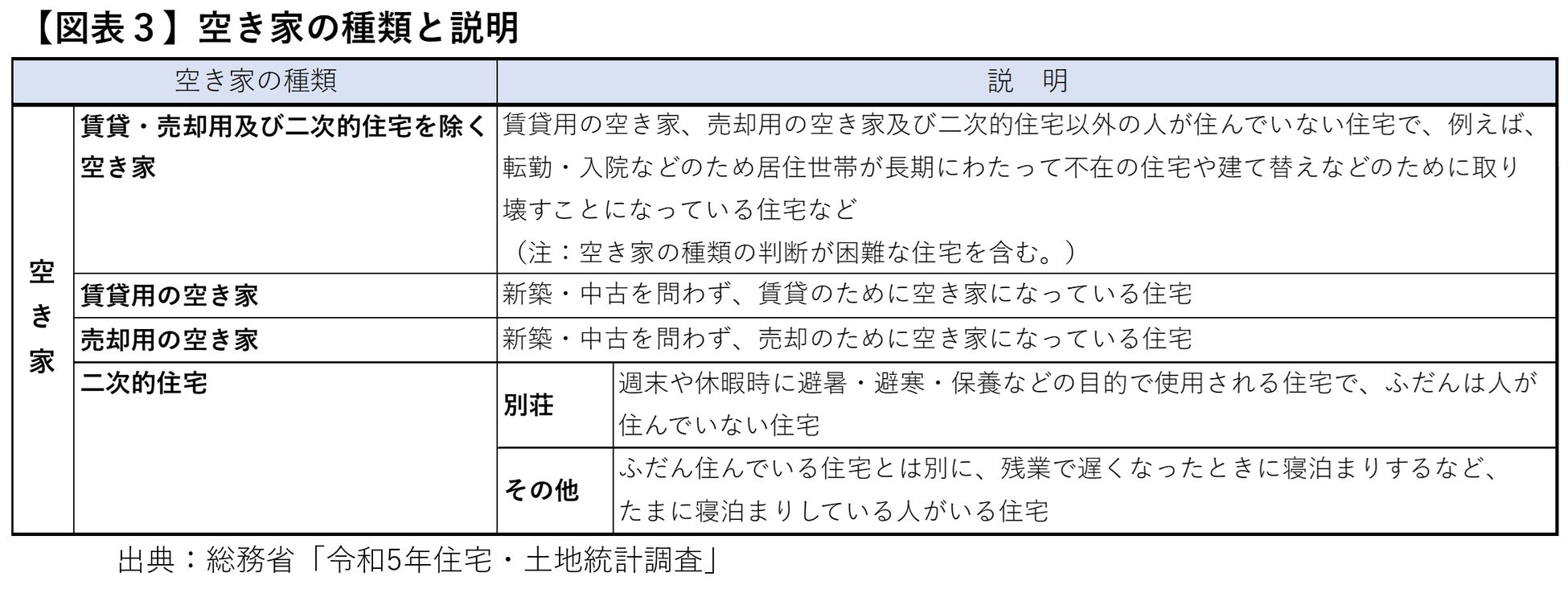 かたや、「賃貸・売却用及び二次的住宅を除く空き家」(本レポートでは「その他空き家」と称します)は、賃貸や売却用、別荘などを除き、長期にわたって居住者が不在の空き家であり、将来的に維持管理が不全となる可能性が高く問題が大きいとされています【図表3】。