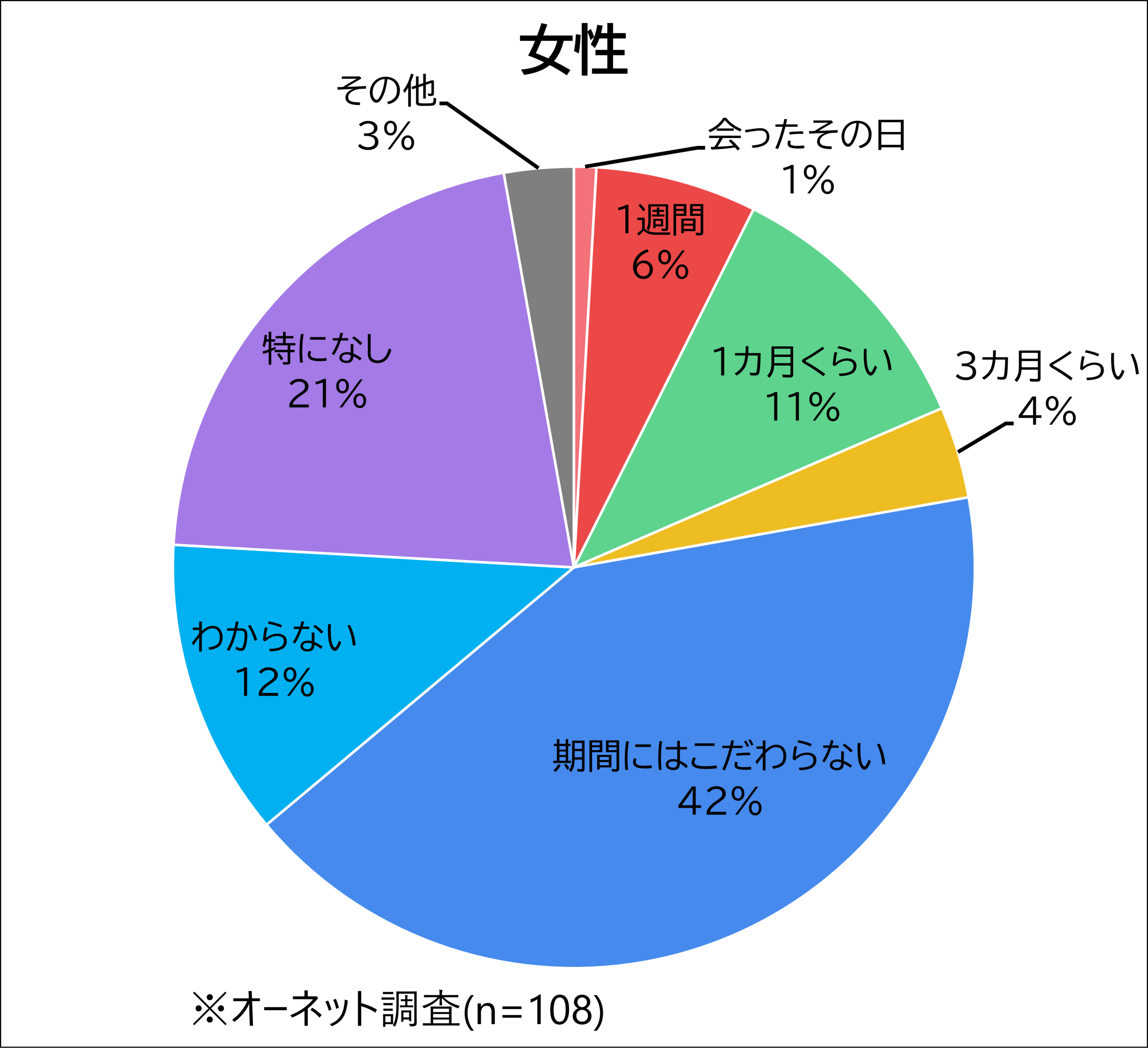 ✓ 「会ったその日」の回答は男性が6%に対し女性は1%となっており、女性は告白までにある程度の期間は必要だと考えていることがわかりました。
