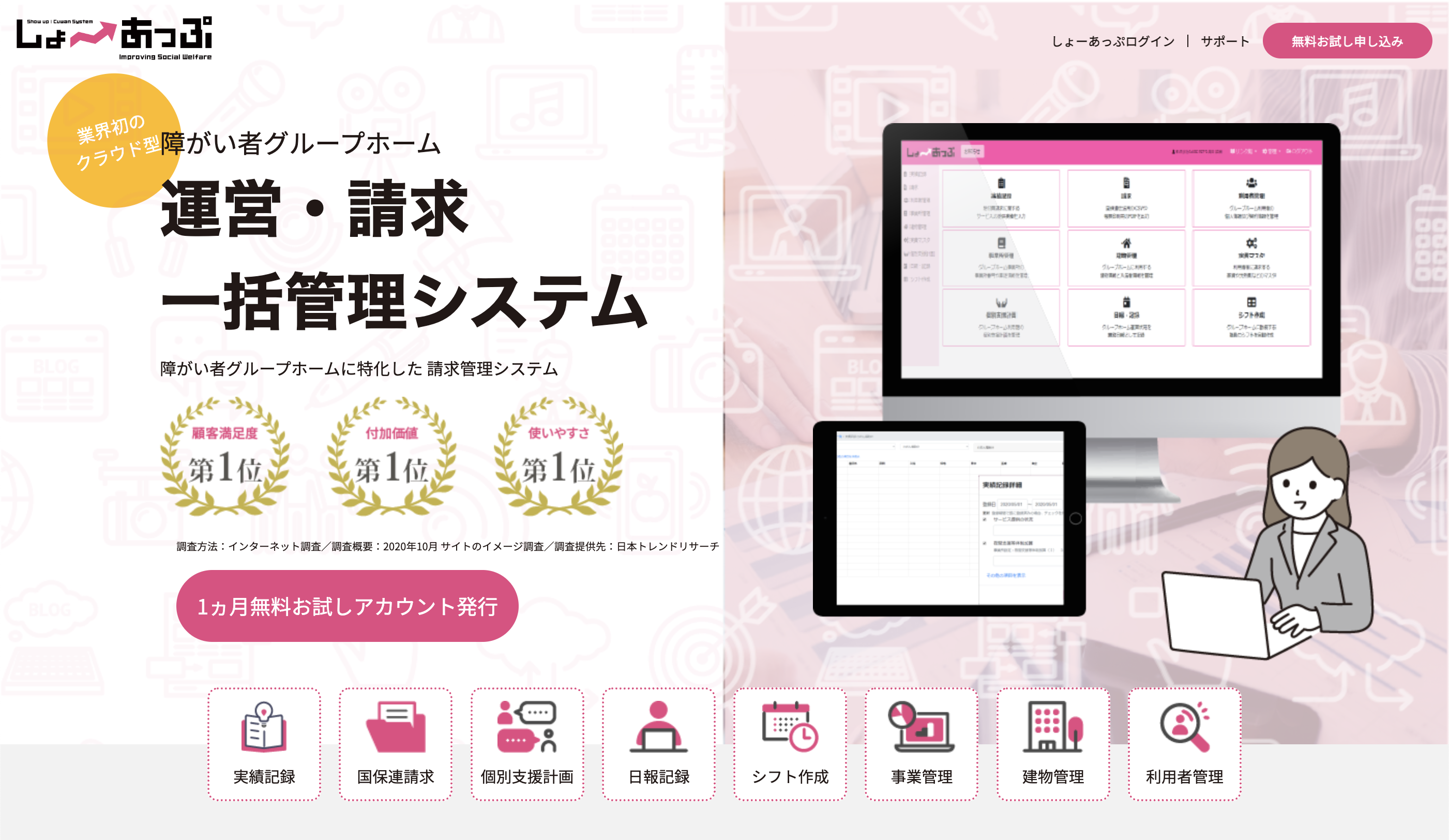障がい領域をテクノロジーから変革していくことをミッションとし、“業界初”となる障害者グループホーム特化型の運営と請求業務を一括管理できるクラウドシステム「しょ~あっぷ」の開発と販売をしております。日々の業務管理、国保連(国民健康保険団体連合会)請求、シフト管理など必要な業務をこのシステム1つで効率的にこなせるシステムです。