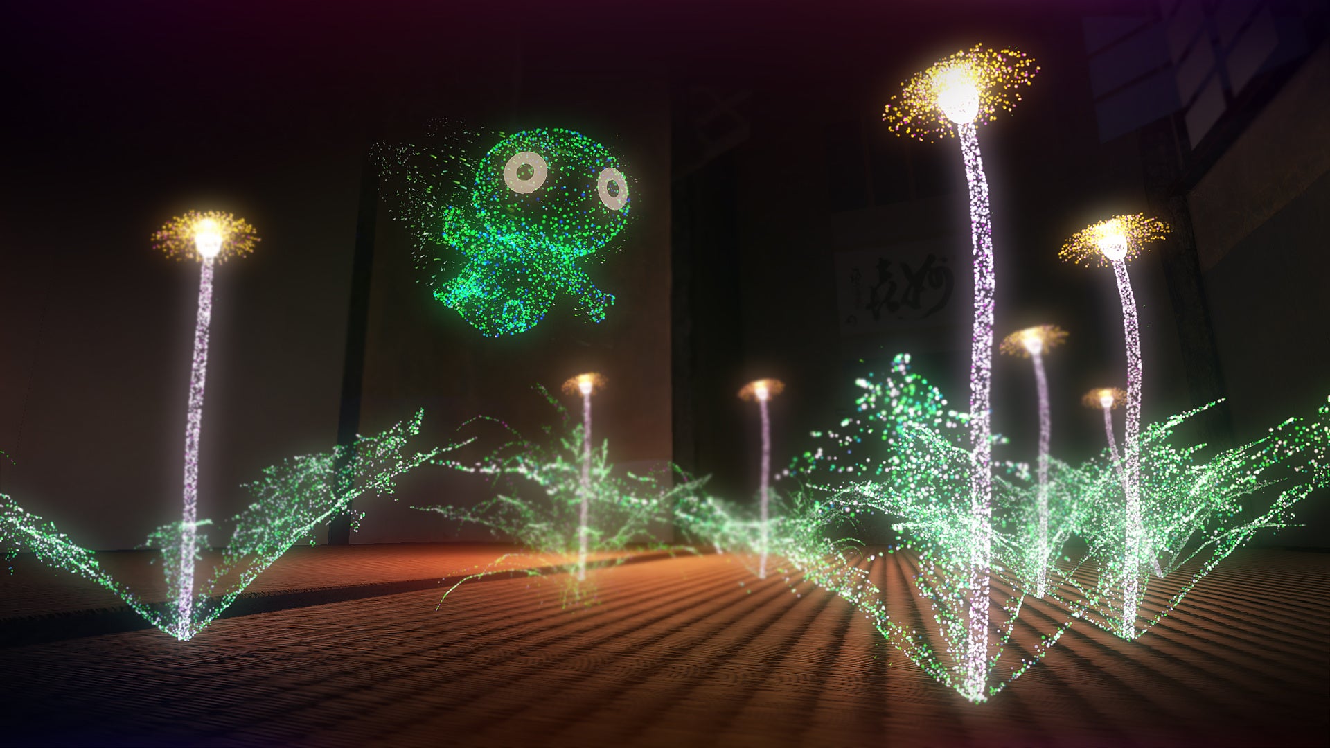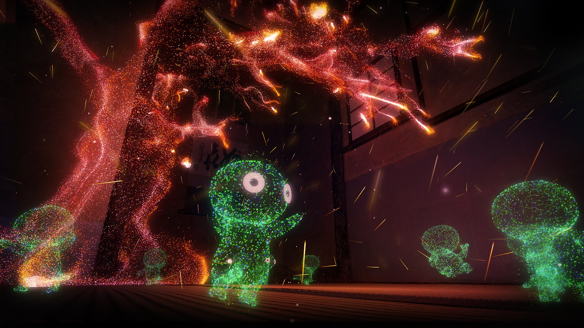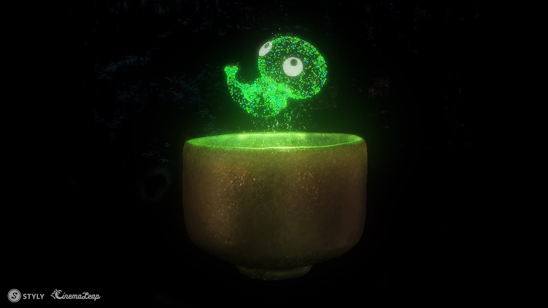 この作品は日本の伝統文化である「茶道」をベースにしています。体験者は、日本の茶室に身を置き、黒樂茶碗『万代屋黒』を両手に持って日本の伝統世界を体験します。体験者は薄暗い茶室の中、自分の手の中の茶碗から生まれるお茶の精霊"Sen“を通して、自分と世界との関わりを知ります。最初は恐る恐る世界を知っていく“Sen“ですが、様々な存在に関わることによって、自分が存在することの喜びを知ります。美しい世界が目まぐるしく変わる中、“Sen“は自分たち以外に、同じような存在がこの世界に存在していることに気づきます。他の存在との繋がりや、関わりが心地よく、自己中心的に目の前の存在と関わることばかりを考えるようになります。そんなある日、突然自分の心地の良い世界が大火によって全て消失してしまいます。何もかも失ってしまった”Sen”は茶碗の中に落ち、自分の存在が宇宙の中で粒子となり溶けてしまいます。“Sen”と体験者は、この世界の生きとし生きるものあらゆる存在と自分は共にあるということに気づいた時、自分の存在が、茶室に戻っていることに気づきます。そしてまた何気ない日常が始まります。