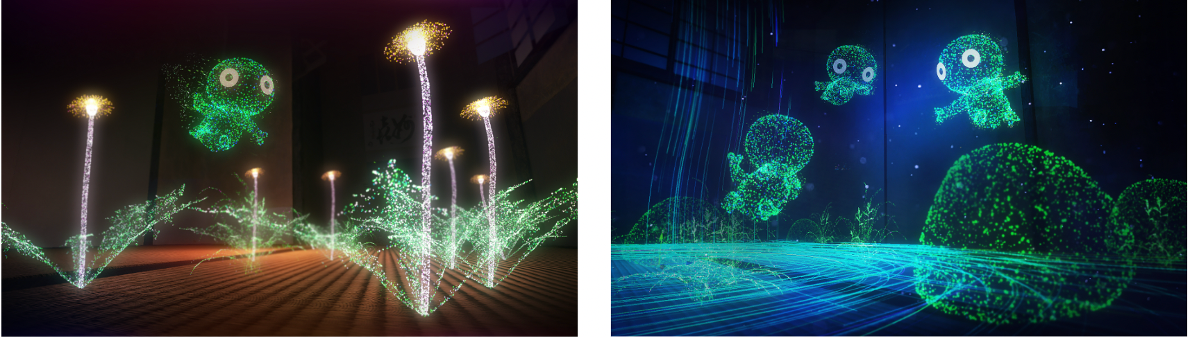 体験者の心拍データをリアルタイムでメタバースと通信・共有することで、鼓動データを映像内の光に変換するなど生々しい心臓の鼓動を感じることが出来ます。