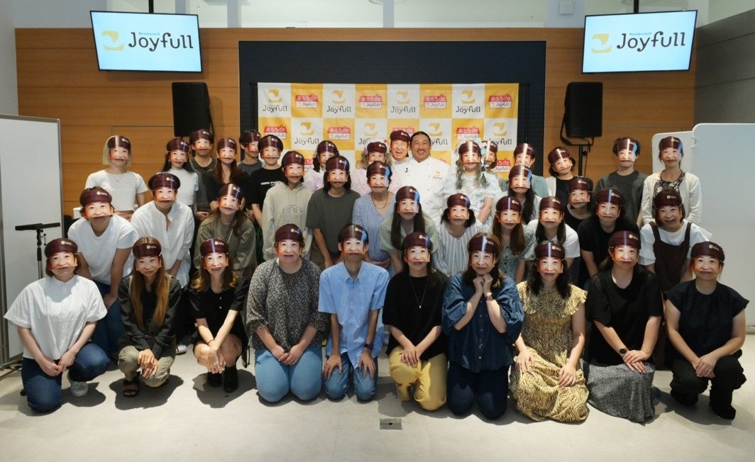 ロバート秋山竜次さんは、今回の発表会のタイトルを「全面協力!全面参加!」と定めた理由を、「(ロバート秋山竜次さんがジョイフル宣伝部長として)ジョイフルが東京でもさらなる話題になるために、会場の皆さん全員に私のお面を被ってもらい、視覚的にインパクトのある試食会にしたいと考えた」と説明しました。一般参加者、メディア関係者、会場スタッフ全員は配布されたロバート秋山竜次さんのお面をかぶり、会場がロバート秋山竜次さん一色に。異様な雰囲気に包まれながら、ロバート秋山竜次さんによる一般参加者へ直接インタビューなど、会場全体が笑顔と活気に満ちあふれていました。