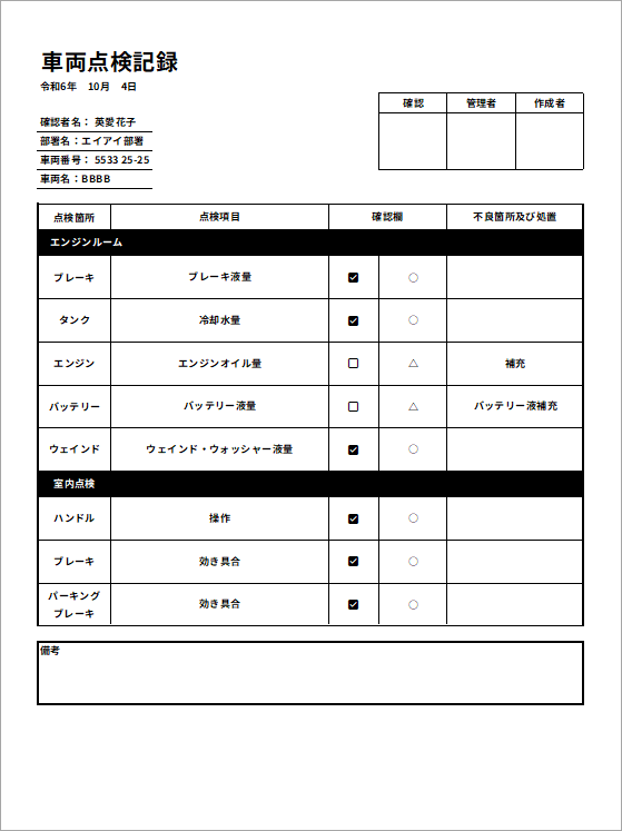 車両点検記録では、日常点検項目に対する記号チェックや確認者情報の記載が行われており、従来は転記ミス防止のため複数名での確認作業が必要でした。本サービスでは、記号を含む点検結果を高精度にデータ化し、実施日や確認者、点検内容を即時に集約。その他の作業日報・出勤簿などの帳票も含め月約500時間の業務時間削減を実現するとともに、全車両の点検状況を可視化できる体制を構築しました。これにより、安全リスクの早期把握と迅速な対応が可能となり、管理品質の向上と標準化を実現しています。