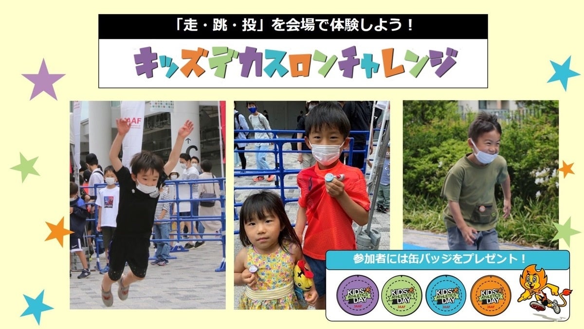 6月11日(土)・12日(日)には、会場正面ゲート前の出展ブース付近で、小学生以下(引率者必須)を対象に陸上競技の「走・跳・投」を無料で体験できる「キッズデカスロンチャレンジ」を実施!会場ではハードルやスターティングブロックなど競技用具の展示も予定しております。