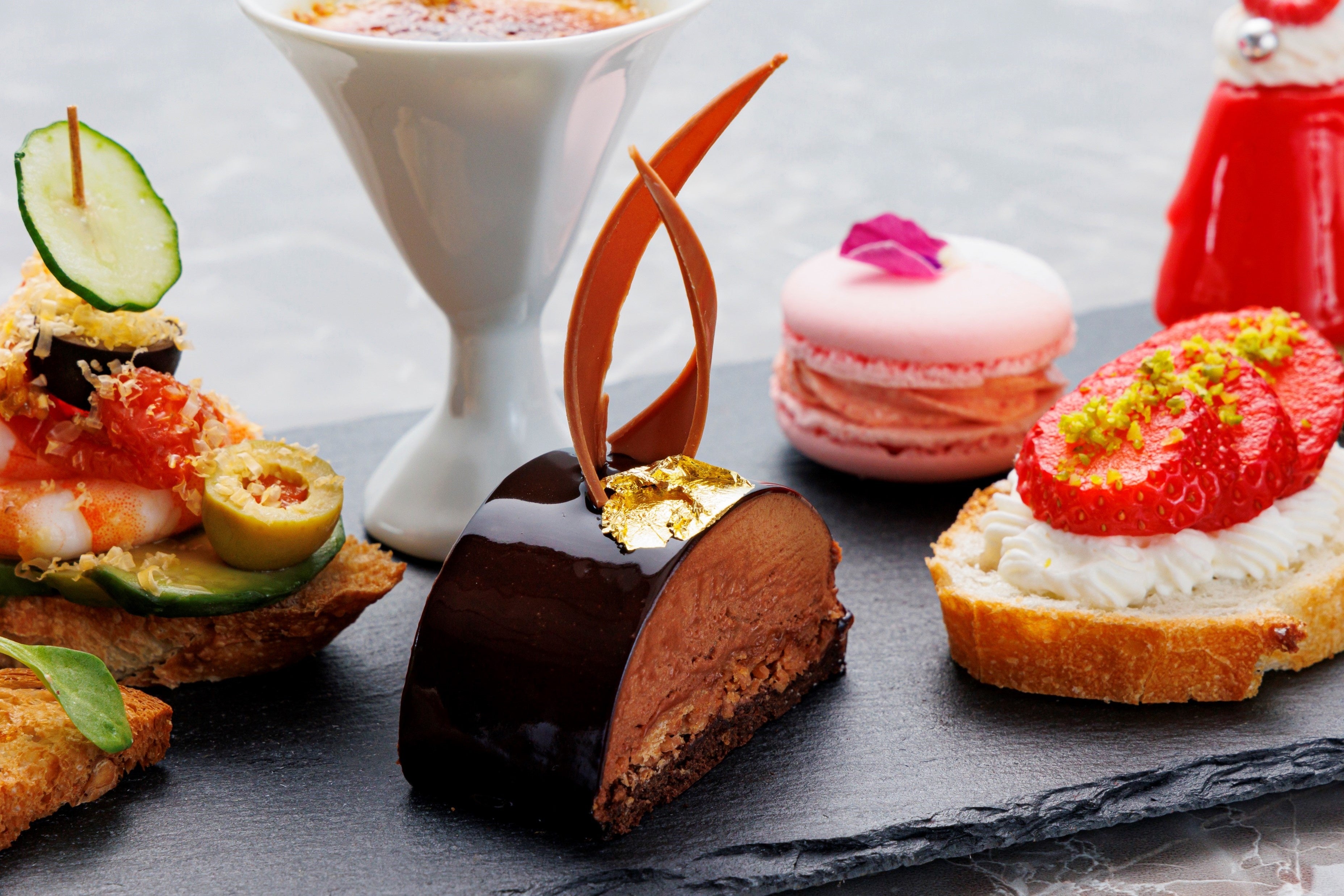 フレンチレストランならではのアフタヌーンティーでは、フランス人にも愛されるタルティーヌ&ミニャルディーズが並びます。タルティーヌ&ミニャルディーズには8種類のチーズを使用しており、パリジャン御用達老舗ティーメゾンの『クスミティー』と共に味わっていただけます。さらに、ワインフリーフローがついたプランもご用意しております。大阪駅直結28Fから望む景色と共に、フランスのエスプリをこころゆくまで感じながらお楽しみください。