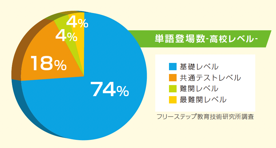 大学入学共通テストで必要な英単語数は4,000~6,000単語だといわれ、語数は年々増えています。その数は膨大ですが、使用されている単語レベルを分析してみると、基礎レベルが74%と大半を占めます。つぎに多いのが共通テストレベル18%で、2つを合わせると9割以上の英単語をカバー。つまり、基礎・共通テストレベルを極めるだけで高得点が獲得でき、そこに難関レベルを上積みできれば難関私立大学合格への可能性を高められるのです。
