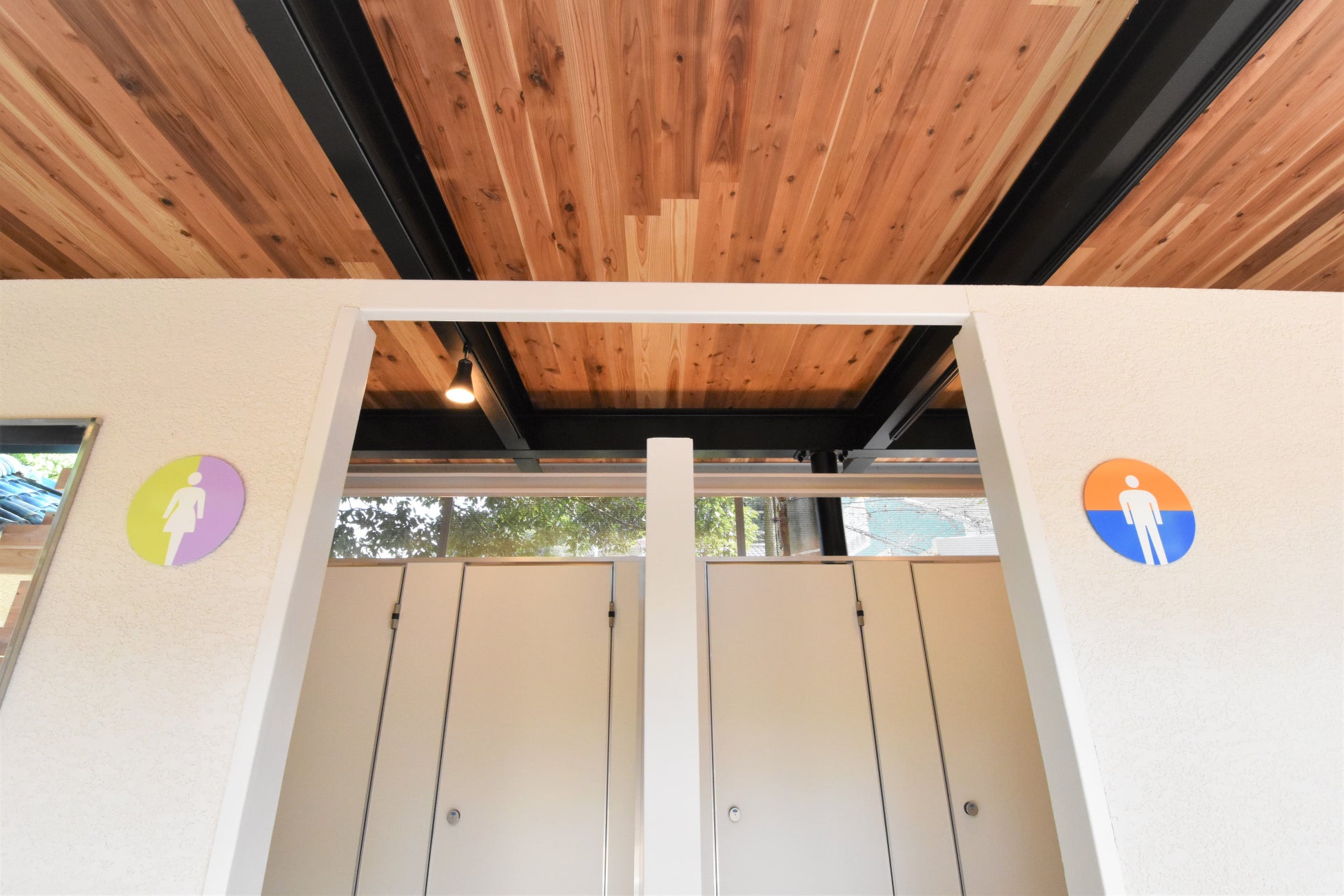 また、トイレのサインは、“男性は青、女性は赤”といった性別にとらわれない配色とし、鮮やかなカラーでトイレ全体のワンポイントとなるようなサインとしました。