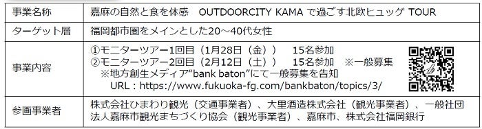 本取組みは、令和2年度3次補正予算事業 既存観光拠点の再生・高付加価値化推進事業(交通連携型)の採択を受け、嘉麻市の交通事業者である株式会社ひまわり観光や大里酒造株式会社、一般社団法人嘉麻市観光まちづくり協会等と、「嘉麻市アウトドアシティ宣言」と連携したモニターツアーを実施いたします。