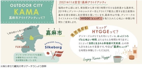 嘉麻市は2021年11月に、観光まちづくりの取組みをさらに進展させるため、“アウトドアキャピタル(アウトドアの首都)”を標榜しているデンマークのシルケボー市との連携を軸にデンマークのライフスタイルである「HYGGE(ヒュッゲ)」を基調とした嘉麻流アウトドアによる心地よい体験と時間の提供を可能にするアウトドアシティを目指すことを宣言しました。