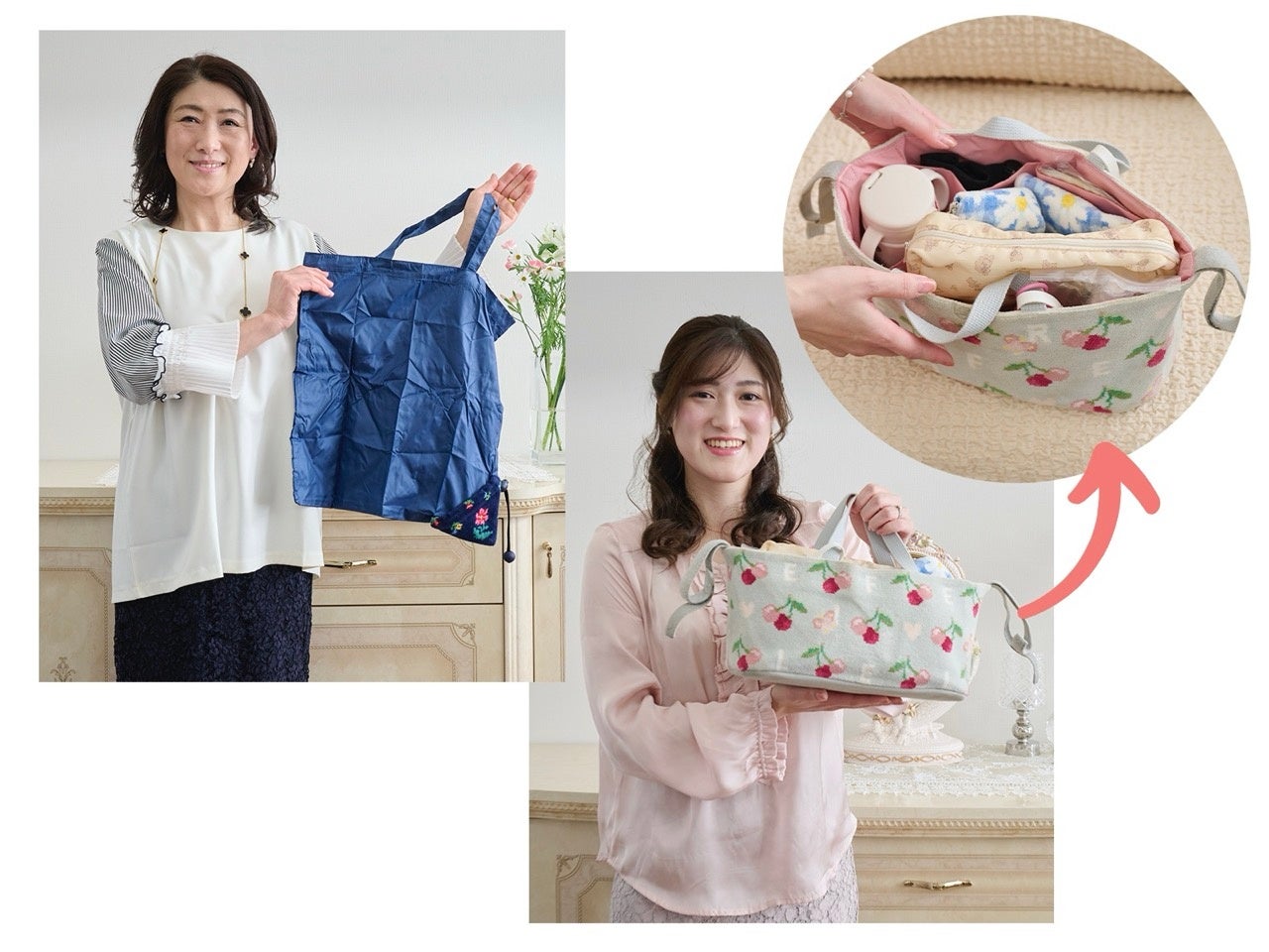 「特に気に入っているのはベビーカーポーチです。水色のベビーカーと相性のいいシルバーグレー地の『キープスマイリングチェリー』を選びました。取り外しがしやすく、バッグとして持ち歩くこともできるので便利。チェリーのかわいらしい感じが自分の好みにも合って、気分も上がります」。エコバッグを使ってくださっているというお母様は、「最近はどこへ行くにも必要ですし、おしゃれでコンパクトに持ち運べて、助かっています」と話してくださいました。