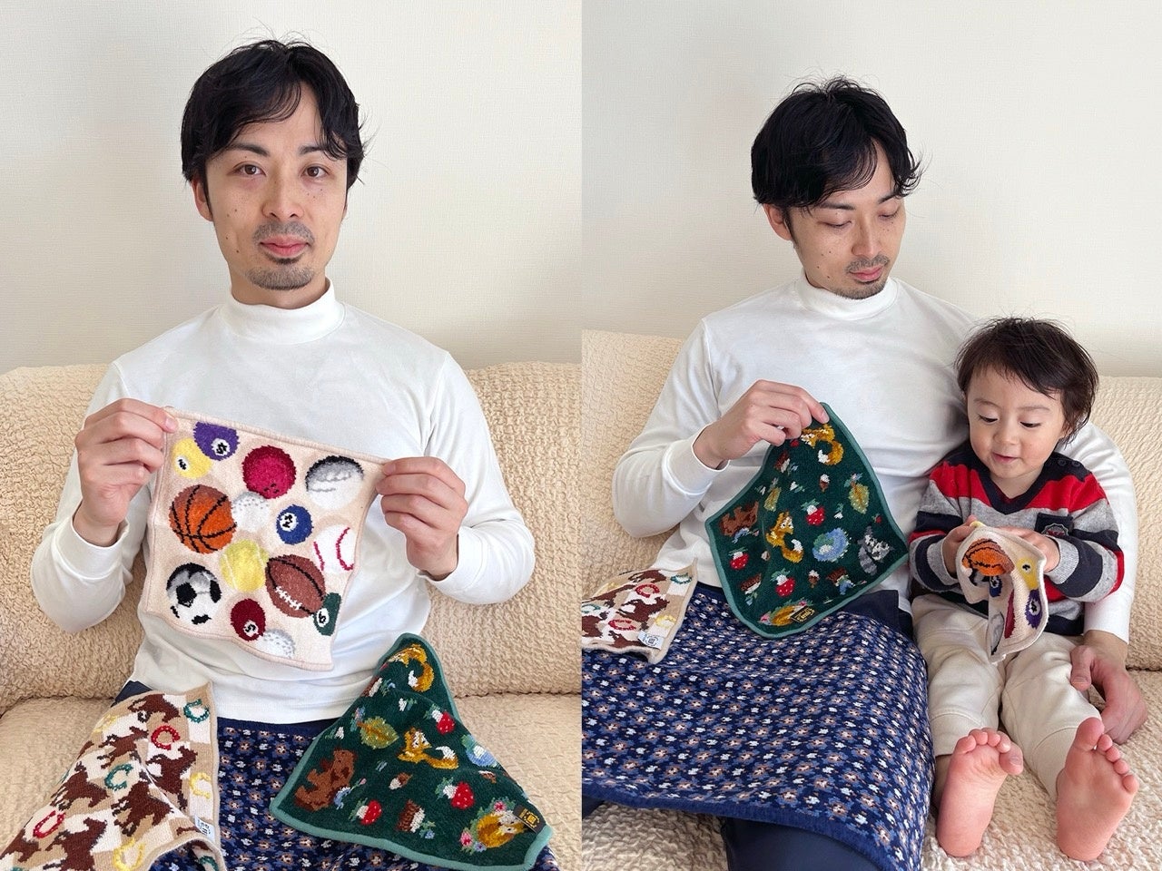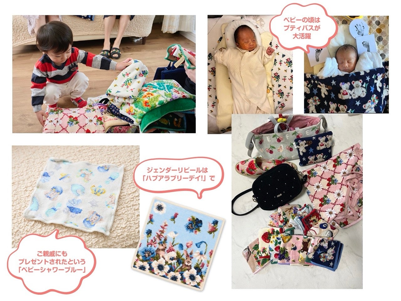 そんなカンナさんはご出産前、ご親戚に性別を発表する際に、『ハブアラブリーデイ!』のハンカチを選んでくださったとのこと。「義母が遠方に住んでいますので、何か青いものを送ろうと考えていました。ちょうどその頃にショップをのぞいたら、アネモネの花畑にうさぎたちがいるペールブルーのハンカチを偶然目にしまして。うさぎ年ですし、ブルーですし、『これは!』と思って決めました。あれはまさに運命的な出会いでしたね」。