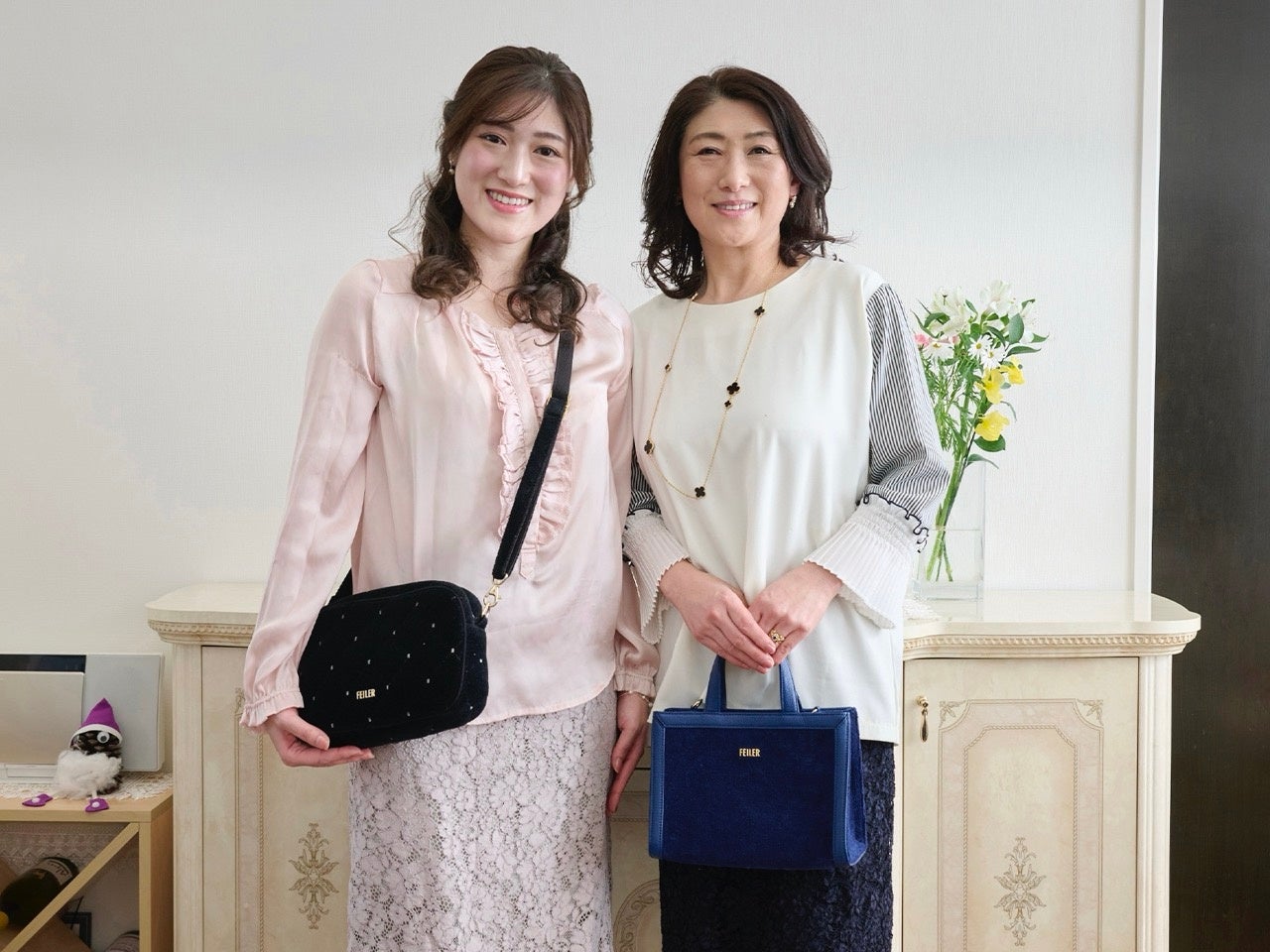 「フェイラーユニアイコニック」のアイテムは母娘でご愛用くださっているとのこと。カンナさんは黒のショルダーバッグがお子さんと外出するときの必需品。「両手があくものをと思ってショルダータイプを探しているときに、お店で出会ったものです。ダブルファスナーで使いやすく、大きさが最高。オムツやウェットティッシュなどがおさまる程よいサイズでかさばりません。周りのママ友達にも『素敵ね』と褒められます」。一方、お母様はスクエアトートをよく手に取ってくださるそう。「ネイビーのバッグは学校や、ちょっとかしこまった場所に行くときによく使います。紺のスーツを着ることが多いので、合わせやすいですし、ちょっと持っていくのに便利なサイズ感です」。