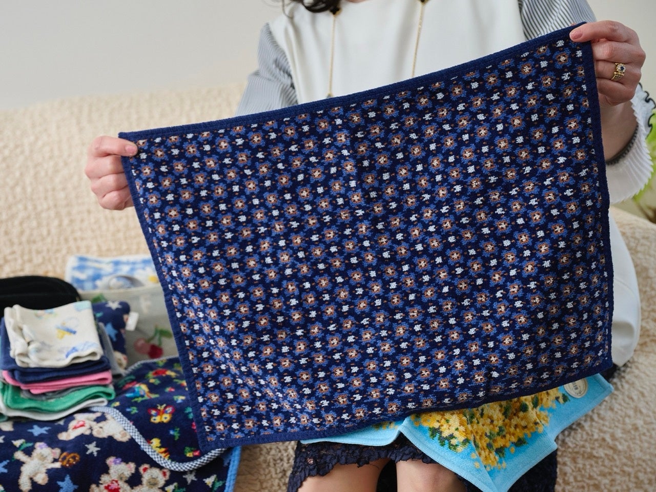 「私も母が使っていたのがきっかけです。母を含めると、四世代で愛用させていただいていることになりますね!私は小さい頃から肌が弱く、当時なかなか合うタオルがなかったのですが、母のハンカチを使ったとき、なんて肌に優しいんだろうと感激しまして。デザインも魅力的ですが、私にとっては何よりも肌ざわり。その頃は天日干しが主流でしたが、外に干しても変わらない柔らかさに心底惚れ込みました。それ以来、使い続け、今では娘や孫へと受け継いでいます」。