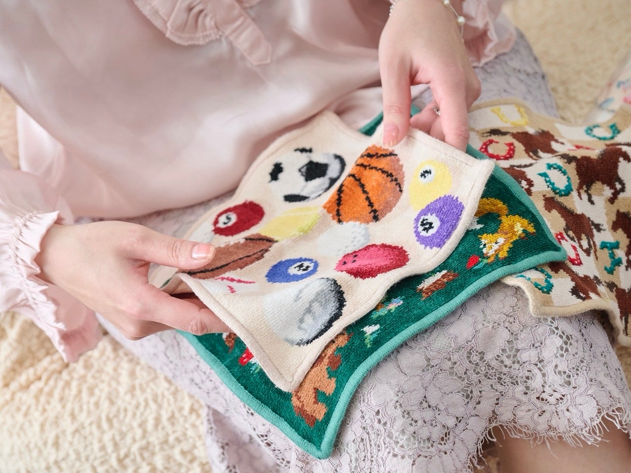旦那様はフェイラーの魅力について、こう話してくださいました。「薄手のハンカチだと特に夏場は、汗を拭くとすぐにベタついて濡れてしまいますが、フェイラーの生地は吸収性も良くて、使いやすいです。スポーツのときにも活用しています。ゴルフとバスケを長年しており、ボールがモチーフの『スポーツパーティ』はお気に入りの一枚。男性の服装は仕事でもプライベートでもモノトーンが多いですので、アクセントにもなると思います」。さらに、こんなエピソードも。「以前、職場の送別会でお礼を用意する役目を任されたことがありまして。そのとき妻に相談して、フェイラーのハンカチを提案してもらったのですが、チームの女性陣に渡したところ、とても喜ばれてほっとしました」。