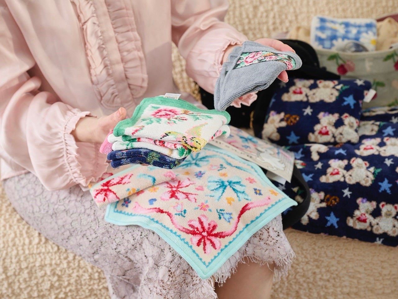 2023年のご出産を機に、カンナさんのセレクトに変化が。「自分の好みとは違うものに目がいくようになり、幅が広がりました。最近は水色のベビーカーに合わせて、なにかとブルー系を選んでしまいます。息子にかかわるものとはいえ、持つのは私ですので、自分の好きなピンクやお花などでいいはずですが(笑)、やはり子ども用品は『リーベ&リリア』などに惹かれますね。今後息子が自分でハンカチなど使えるようになる日が待ち遠しいです」。また、旦那様もフェイラーを愛用くださっているそう。「職場でお礼にいただいたハンカチがきっかけです。それが私と母が大好きなブランドと同じだということがわかり、夫も自然と使うように」とカンナさん。