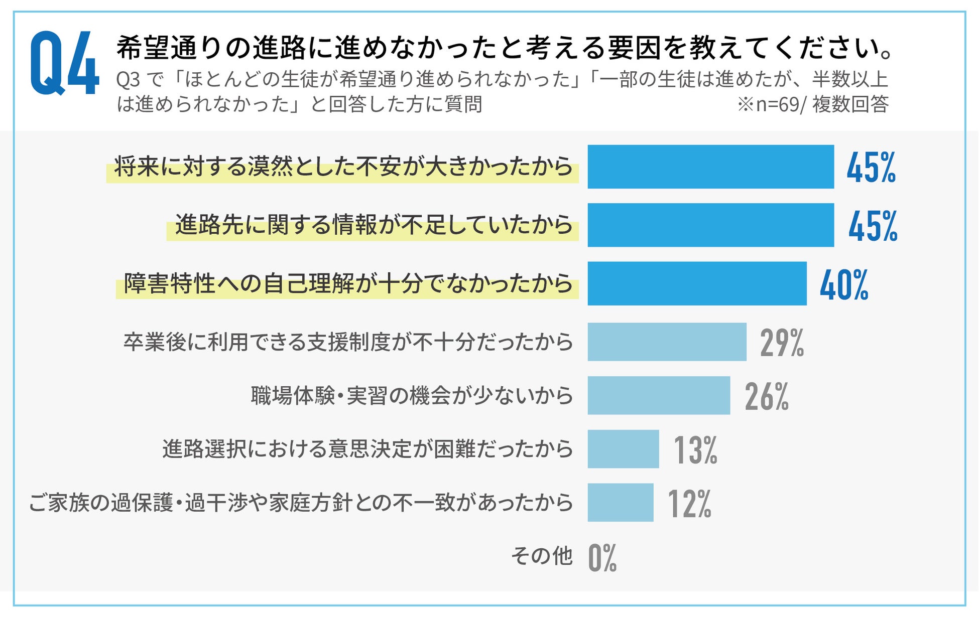 障害のある生徒の進路、7割が希望通り進めず…最多の理由は”マッチング機会の不足“(44%)、障害のある生徒の進路指導に現在携わる教員102名に調査