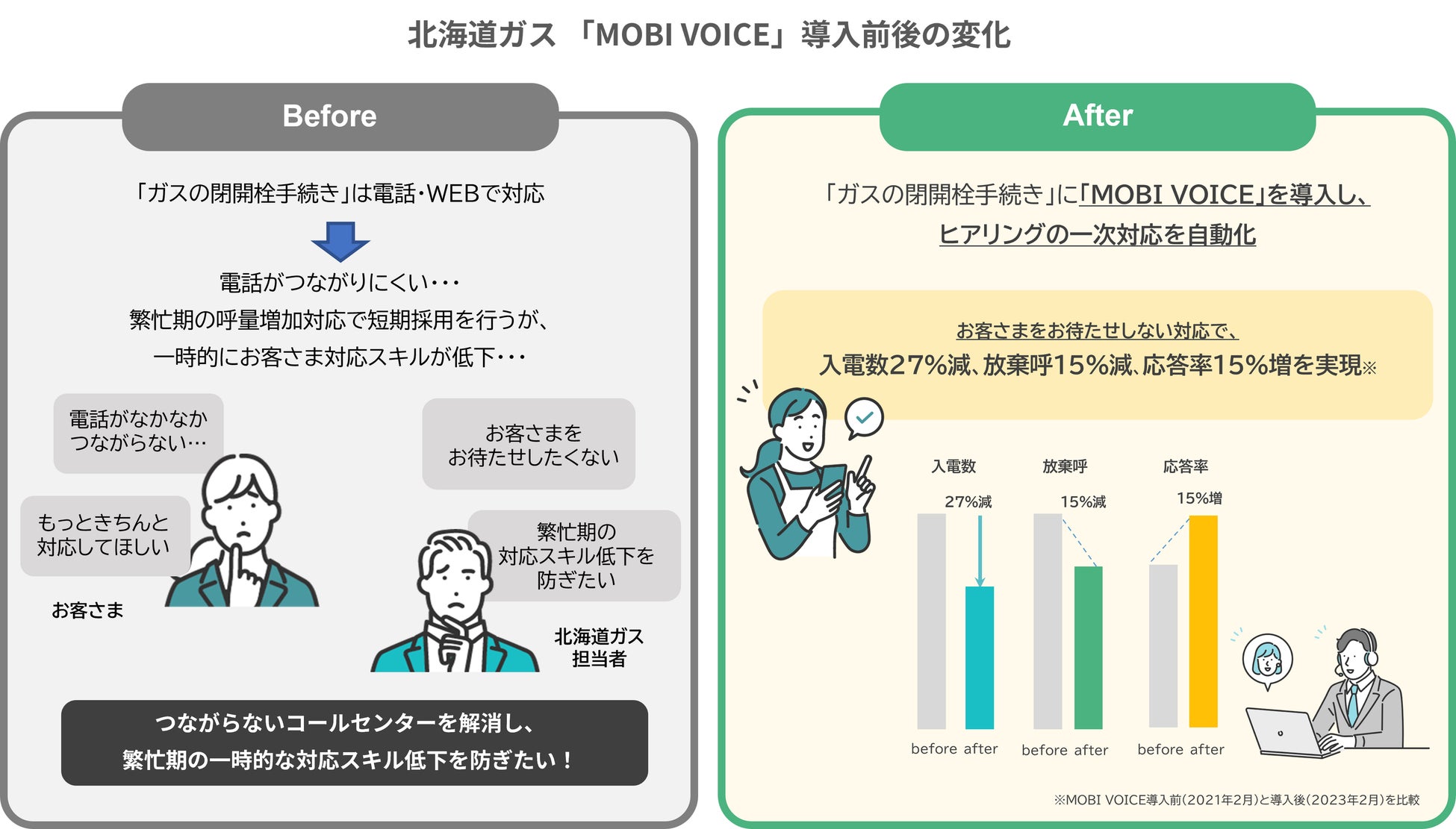 北海道ガスの「ガス閉開栓手続き」に『MOBI VOICE』を提供!ヒアリング自動化により、入電数27%減、放棄呼15%減、応答率15%増に貢献