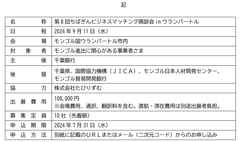千葉銀行(頭取 米本 努)は、2024年9月11日(水)、モンゴル国・ウランバートルにて「第8回ちばぎんビジネスマッチング商談会inウランバートル」を開催します。