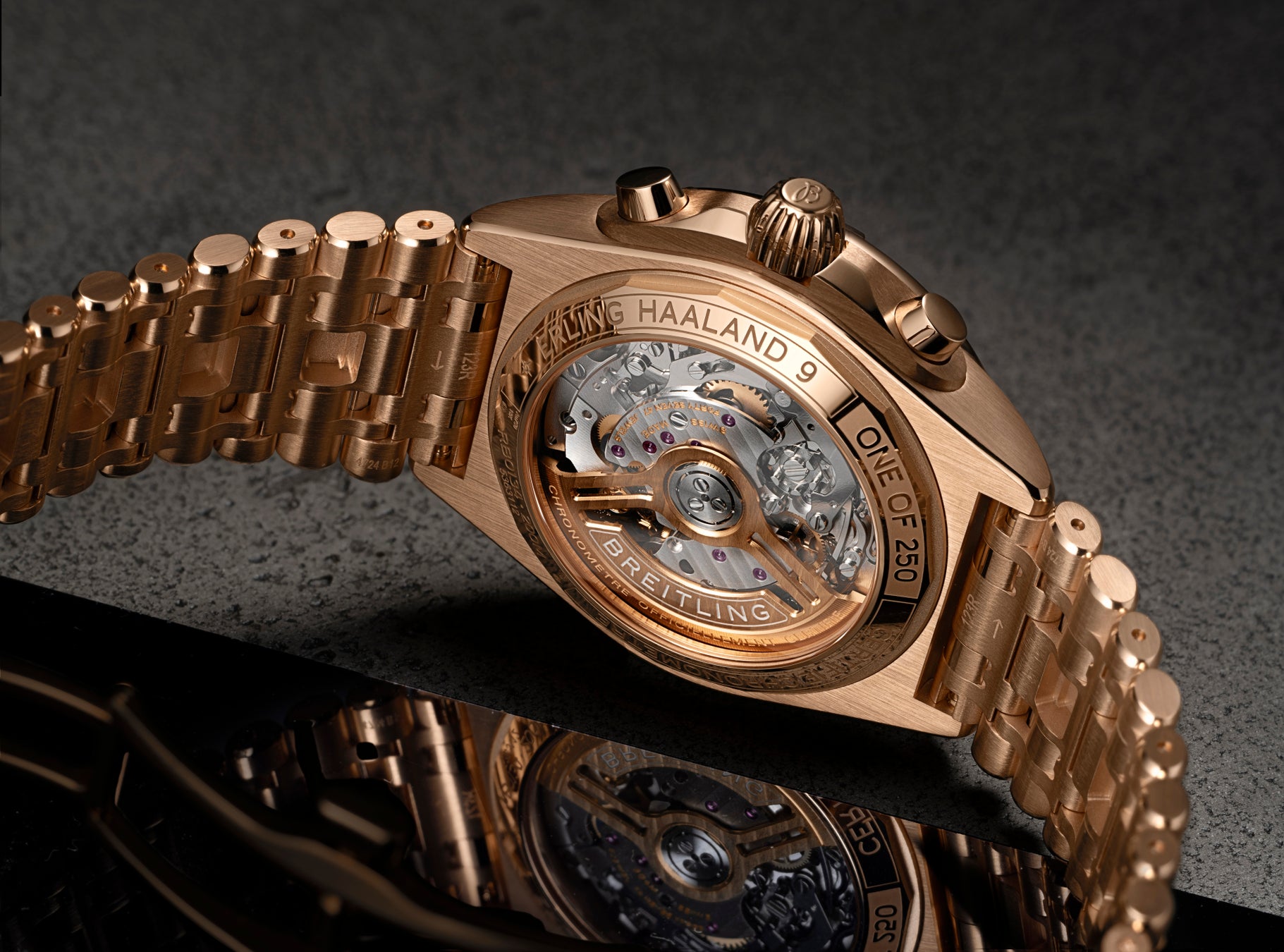コレクションの締めくくりは、ハーランドと彼の同志のために作られた超希少な「ONE OF 5」エディションです。18Kレッドゴールド製のこのモデルは、メテオライト文字盤を採用し、ブライトリング マニュファクチュール キャリバー 01ムーブメントを眺めるサファイアクリスタル製ケースバック、特注エングレービングで彼の名前と背番号が施されたケースサイドが特徴です。ケースバックには、ゴールセレブレーション「ロータスポーズ」をとったハーランドの姿も描かれています。このモデルは、彼の彗星のごとき躍進に敬意を表すごく私的なものとして製作され、一般販売は行われません。