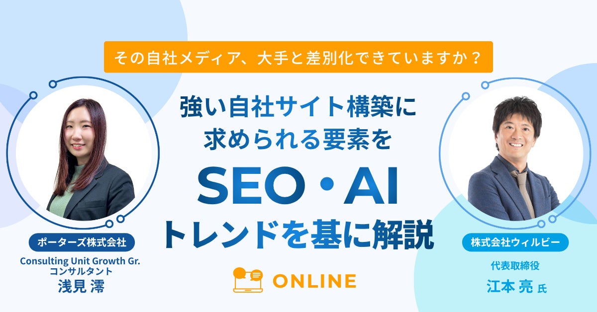 人材ビジネス向けマッチングシステムを提供するポーターズ株式会社(東京都港区、代表 西森 康二)は、株式会社ウィルビーと共同で「その自社メディア、大手と差別化できていますか?強い自社サイト構築に求められる要素をSEO/AIトレンドを基に解説」と題した無料セミナーを2026年4月24日(金)13:00~14:00でオンラインにて開催いたします。