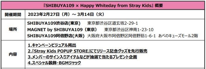 株式会社SHIBUYA109エンタテイメント(本社:東京都渋谷区、社長:石川あゆみ)は、東京・渋谷で運営する 「SHIBUYA109渋谷店」「MAGNET by SHIBUYA109」、「SHIBUYA109阿倍野店」(大阪府大阪市)の3施設にて、2023年2月27日(月)~3月14日(火)の期間、日本やアメリカなど世界中で大旋風を巻き起こし続けている“全米No.1 ボーイズグループ“「Stray Kids(ストレイキッズ)」をキャンペーンモデルに起用したホワイトデーキャンペーン『SHIBUYA109 × Happy Whiteday from Stray Kids』を開催いたします。本企画は、2月10日(金)から開催されているバレンタインキャンペーン『SHIBUYA109 × Happy Valentine dear Stray Kids』の続編となるホワイトデーキャンペーンです。 期間中は「Stray Kids」のホワイトデービジュアルが各施設の内外観に掲出され、現在東京・大阪でオープン中のポップアップストアにてJAPAN 1st Album『THE SOUND』のリリース記念グッズを先行販売するほか、メンバーのサイン入りアイテム等が当たる豪華プレゼント企画、館内でのスペシャル装飾の展示、BGMジャックなど、さまざまな取り組みを行います。