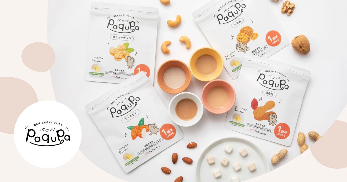 同年10月には、小児のアレルギー専門医監修のもと、「はじめてのひとくち食材応援食」として「paqupa(パクパ)」ブランドを立ち上げ、販売を開始しました。「お子さまのはじめてのひとくち」に寄り添った、保護者目線の食品ブランドです。生後5〜6ヶ月からはじまる離乳食において、食物アレルギーの不安や調理の手間を軽減することを目的に開発されました。たまごや落花生、ナッツ類などの食物アレルギーが気になる食材をキューブ状にフリーズドライ加工した商品を提供しています。