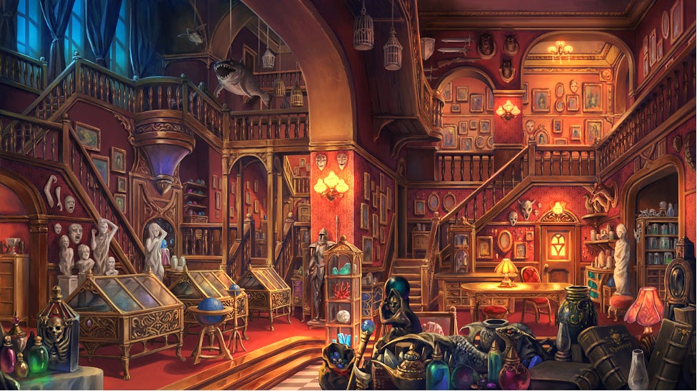 ファンタジー世界の洋館をイメージした空間。不気味な展示室に奇妙な品々など、ドキドキするような異世界をお楽しみいただけます。