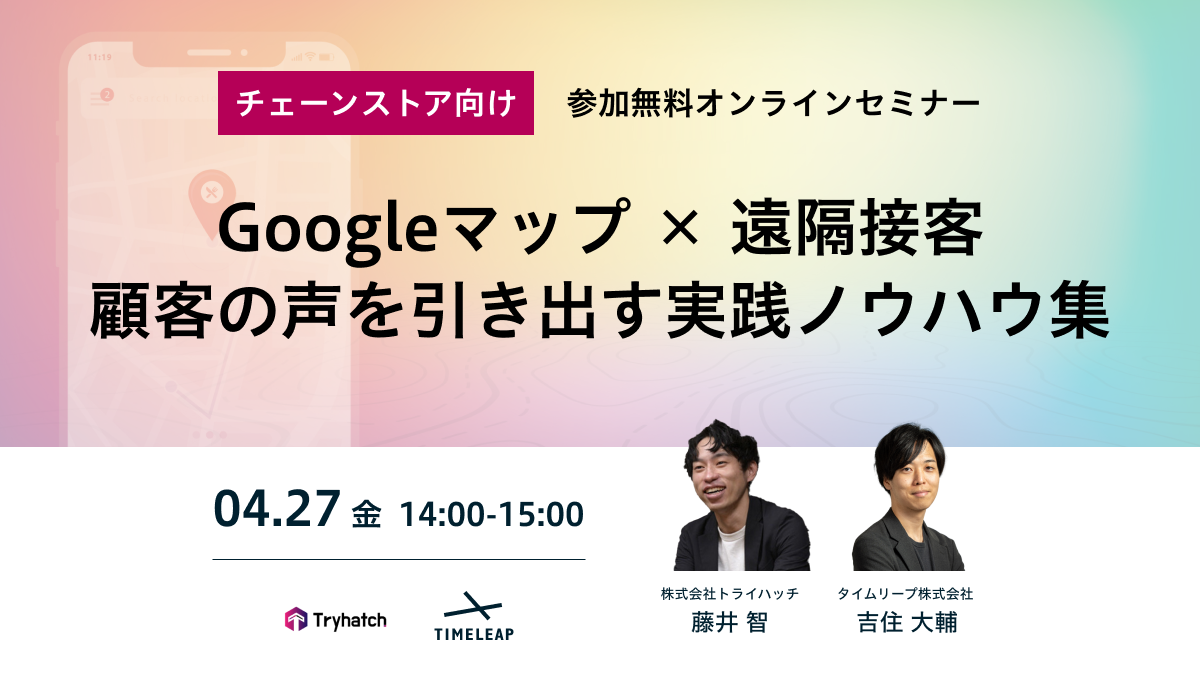 【2023年4月27日(木)14:00〜15:00】トライハッチ × タイムリープ 共催「Googleマップ × 遠隔接客 顧客の声を引き出す実践ノウハウ集」