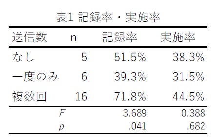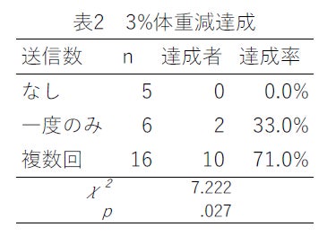サポーターとの会話について、一度以上のメッセージ送信があった参加者の割合は22人(81%)、複数回のメッセージ送信があった割合は16 人(59%)であった。メッセージ送信数別に記録率とスロージョギング実施率(全96日のうち記録・実施がされた日数の割合)を表1に、身体重3%減達成率を表2に示した。その結果、メッセージ送信が複数回あった参加者は他のユーザーより記録率・体重3%減達成率が高かった。