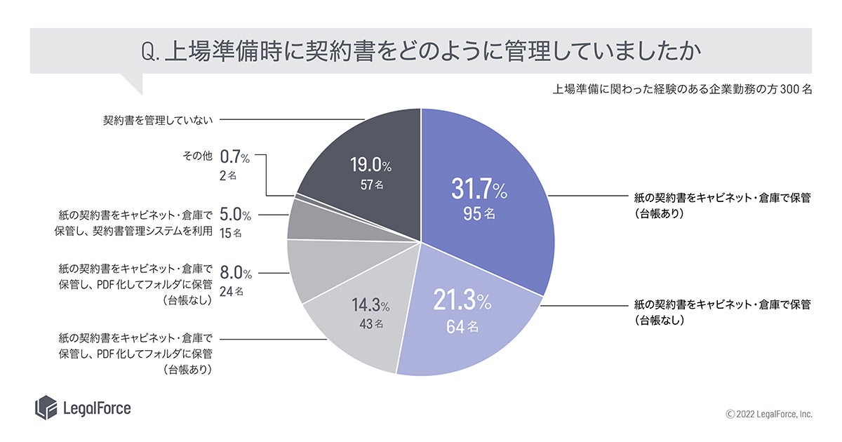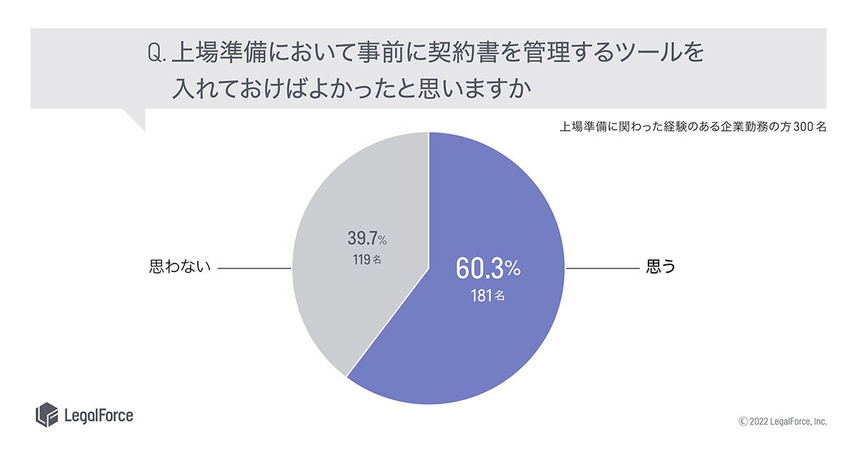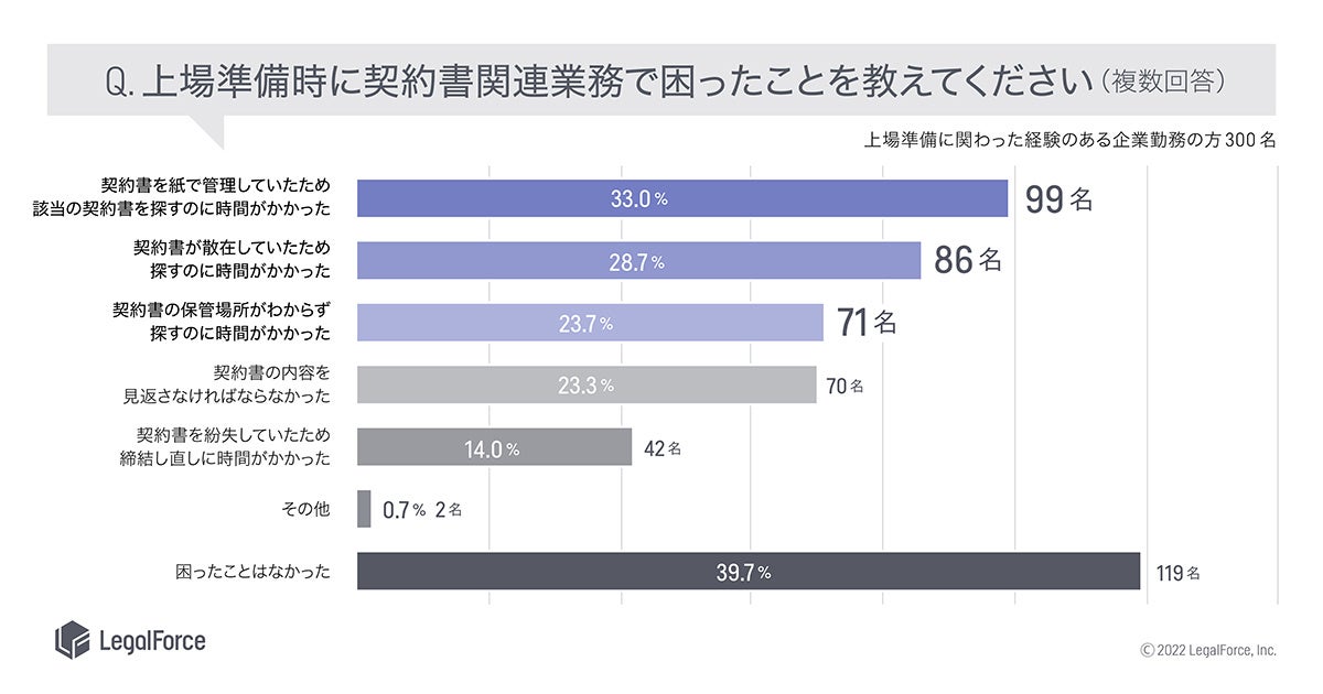 AI契約審査プラットフォーム「LegalForce」、AI契約管理システム「LegalForceキャビネ」を提供する株式会社LegalForce(本社:東京都江東区 代表取締役:角田望、以下LegalForce)は、上場準備に関わった経験のある企業勤務の方300名を対象に、上場準備時の契約管理に関する課題の実態について調査を実施いたしました。