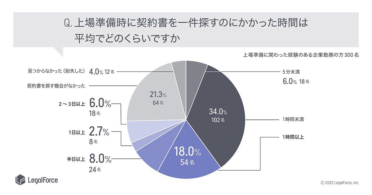 ・上場準備時に必要な契約書を一件探すのに要した時間が「1時間以上」と回答した割合は3割超