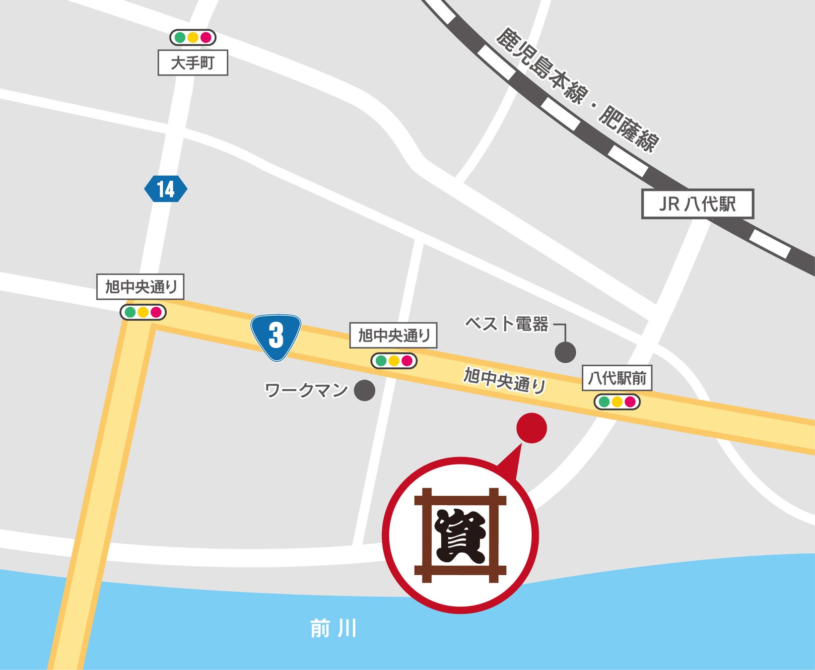 「資さんうどん八代旭中央通店」はJR「八代駅」から徒歩約10分。国道3号線沿いで、公共の交通機関でもお車でも便利にご利用いただける、交通アクセスの良い立地です。お仕事の休憩時や休日のご家族とのお食事など、さまざまなシーンで便利にご利用いただけます。