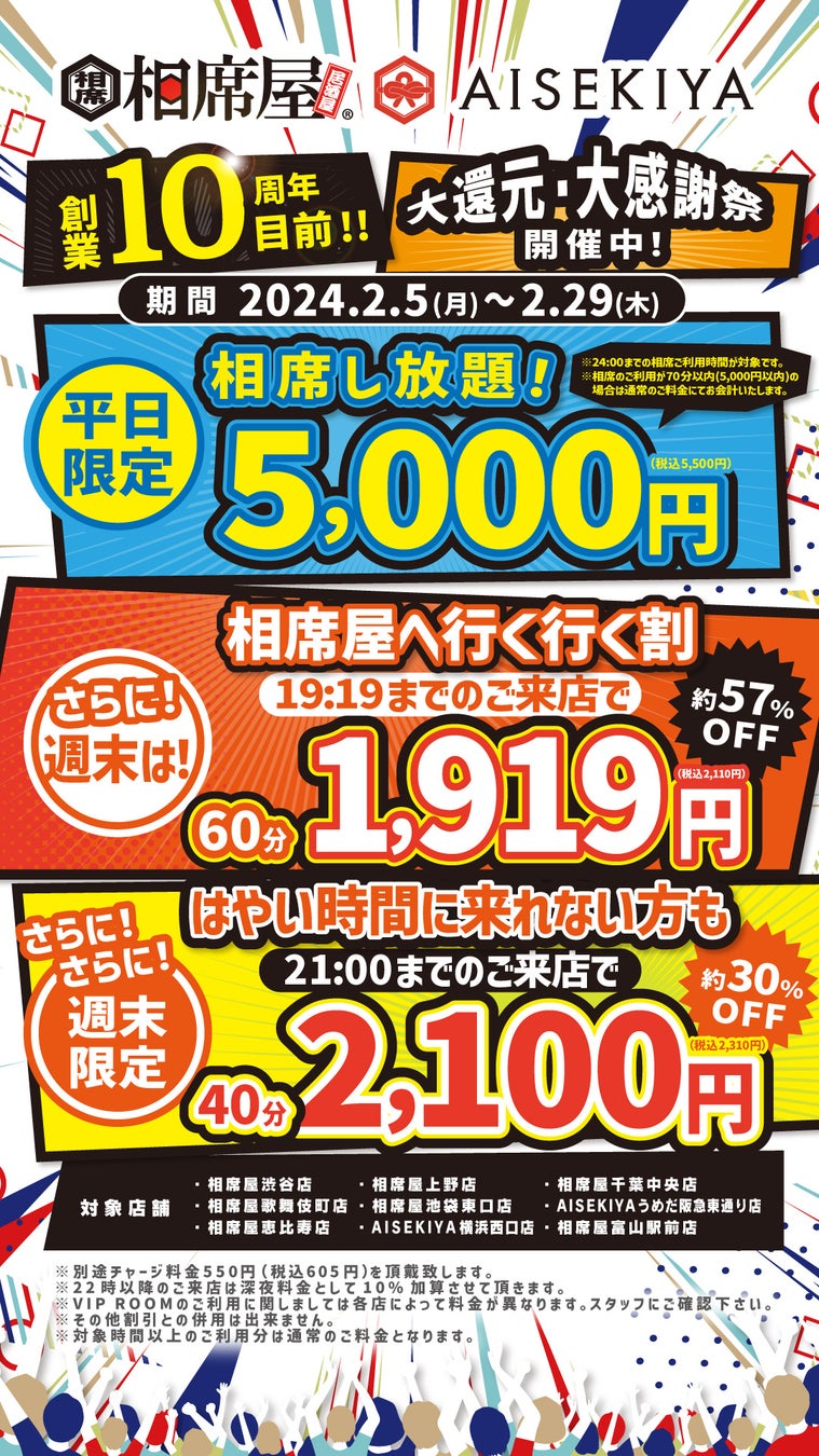 〜相席屋創業10周年まであとわずか!!2月は大感謝祭直前キャンペーンを実施中〜