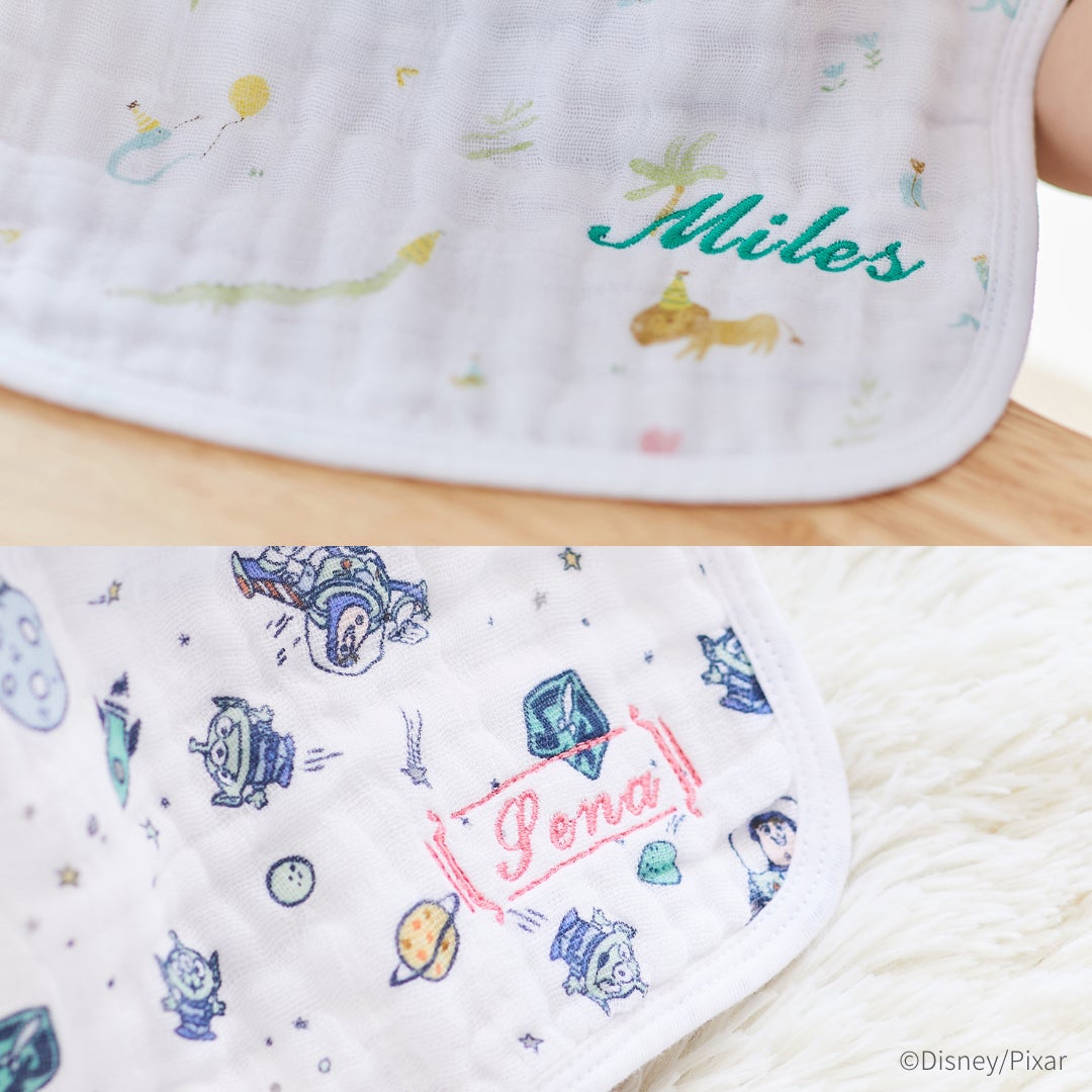 そんな大切なお名前を、エイデンアンドアネイのガーゼアイテムに刺しゅうするサービスです。書体は3種類、カラーは7種類から選択可能。世界に1つだけのギフトは、赤ちゃんの誕生のお祝いとして最適です。