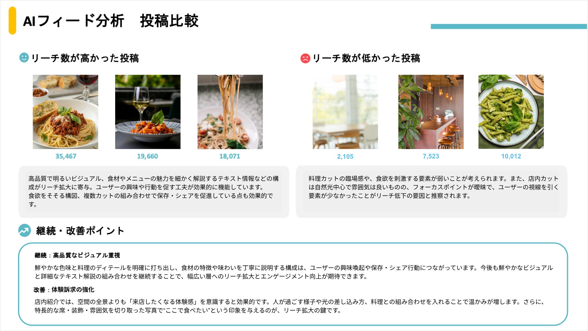 パフォーマンス分類と傾向分析:投稿の成果をもとに、上位・下位の投稿を自動分類し、それぞれの共通点や改善案を提示