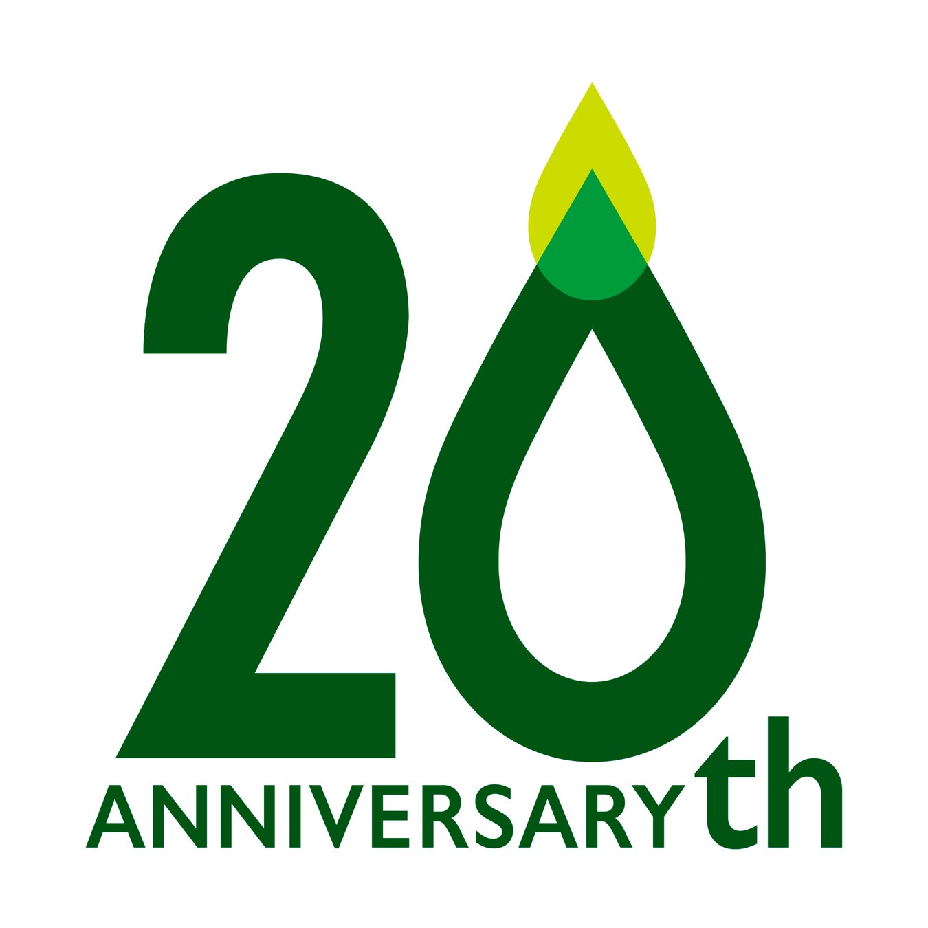 当社はこの節目の年を記念して、記念ロゴを制定しました。当社のコミュニケーションブランドJOYLロゴの「O」は、「グリーンの油滴」をデザインしていますが、記念ロゴもこれにちなみ、2つの「グリーンの油滴」が重なり合うことで20年の積み重ねという意味合いを表現しています。また、お客さまやステークホルダーの皆さまのお引き立てのお陰で20周年を迎えることができたことに対するお祝いのろうそくの炎をイメージし、デザインいたしました。20周年記念ロゴは、2024年12月31日までの期間、当社ビジネスのさまざまなシーンで使用します。
