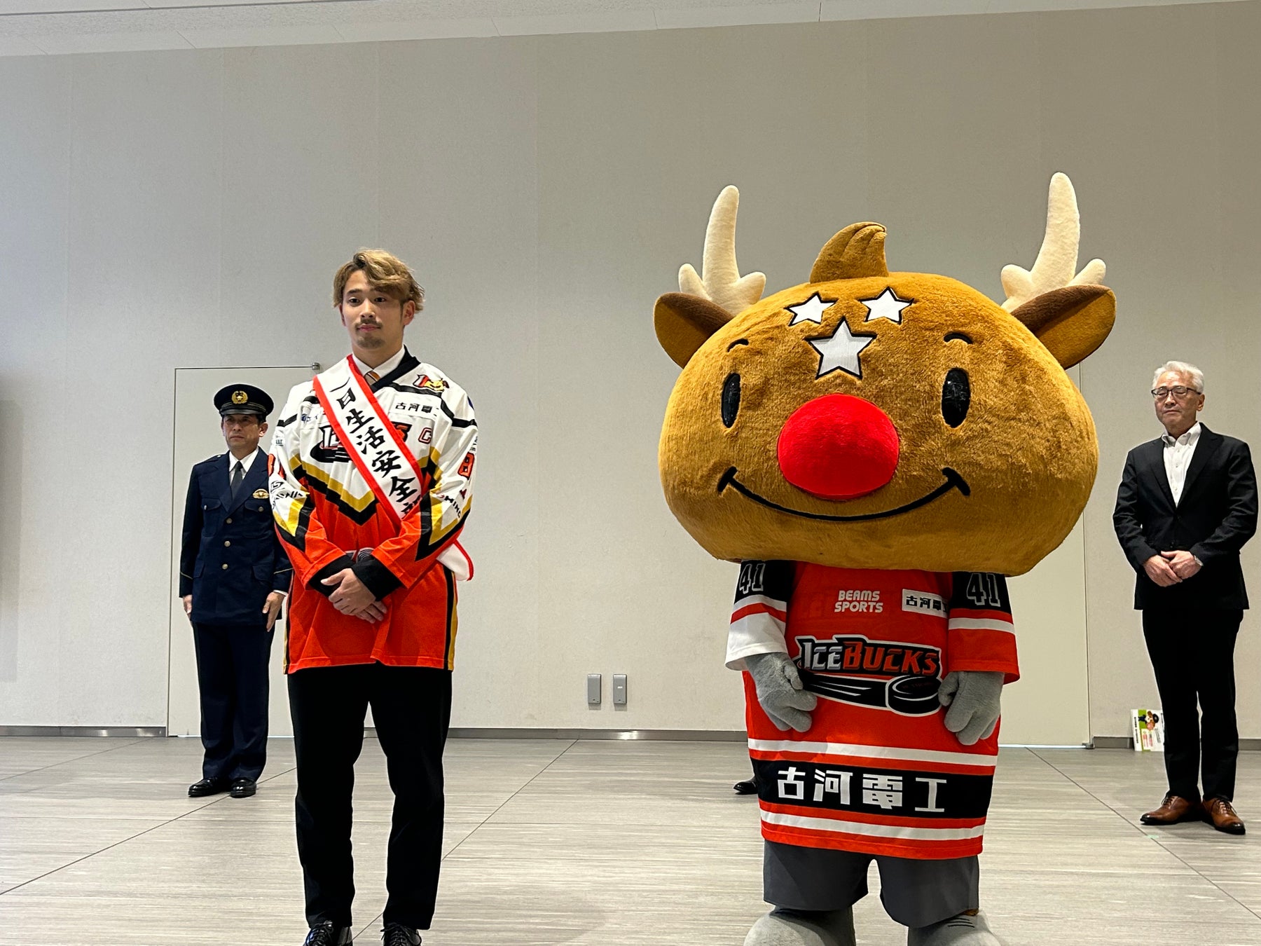 本日、宇都宮駅東口宮みらいライトヒルにて特殊詐欺撲滅広報活動が行われ、アイスバックスより鈴木健斗選手・マスコットキャラクターのしかっちが参加しました。