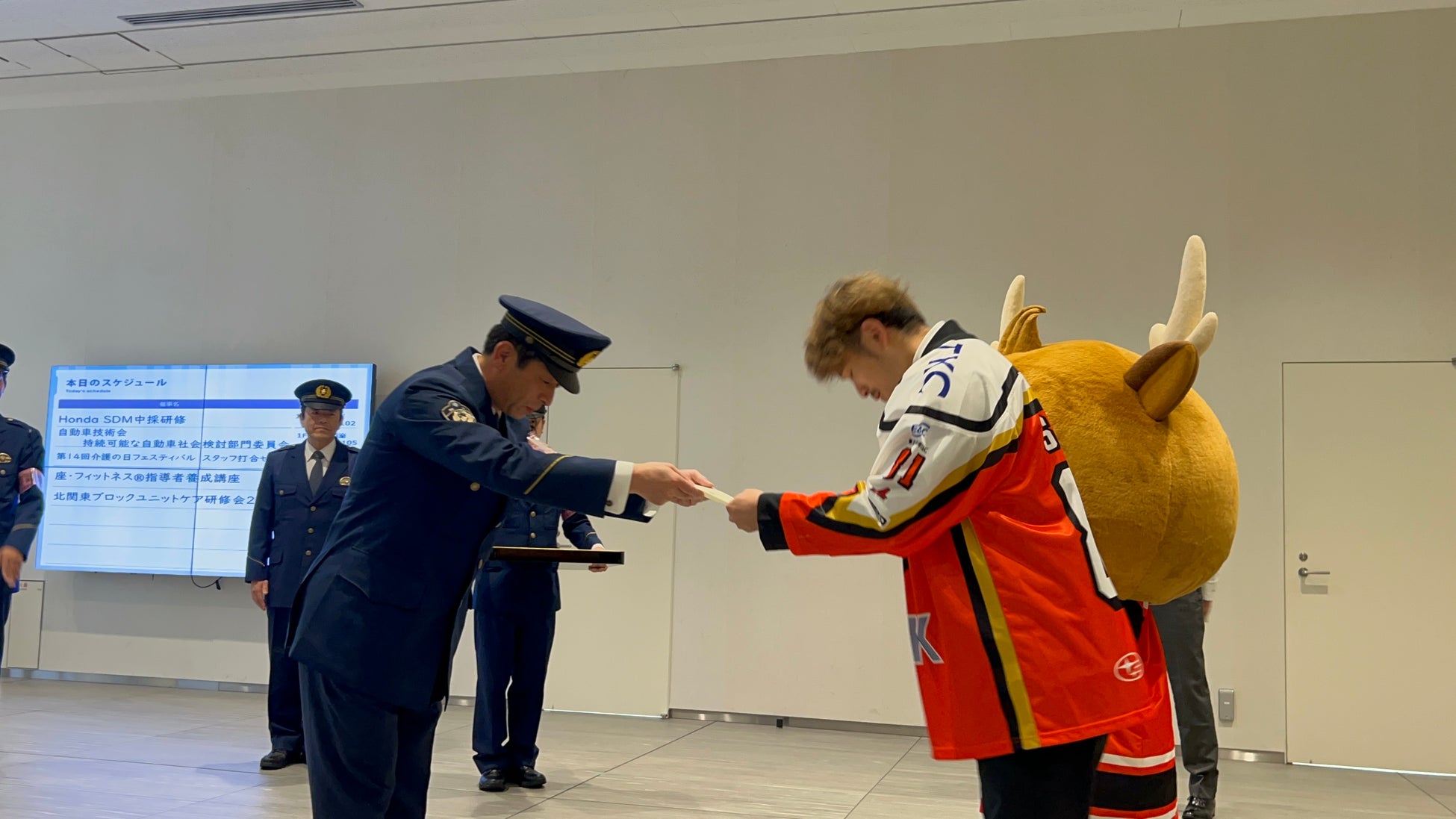 また、栃木県警察より鈴木健斗選手へ「1日生活安全部長」に委嘱状が送られ、広報活動を実施いたしました。