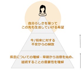 今回、ノバルティス ファーマは、適切な治療により自分らしく、前を向いて、あしたへ向かうことをイメージした「つづけ、ワタシ」の特設ページを立ち上げ、疾患や治療に関する情報に加えて、患者さんと医師とのコミュニケーションを手助けするツールや実際に各地域で患者さんの診療にあたられている先生方の応援メッセ―ジを予定しています。新たに作成した「治療相談シート」は、患者さんがより自分の疾患について考え、「自分らしい生活」や「やりたい」と思ったことを実現するために、生活や仕事・ライフイベントに関して医師に詳しく確認したいことや「こうありたい」との思いを具体的に医師に伝えるコミュニケーションツールになっています。
