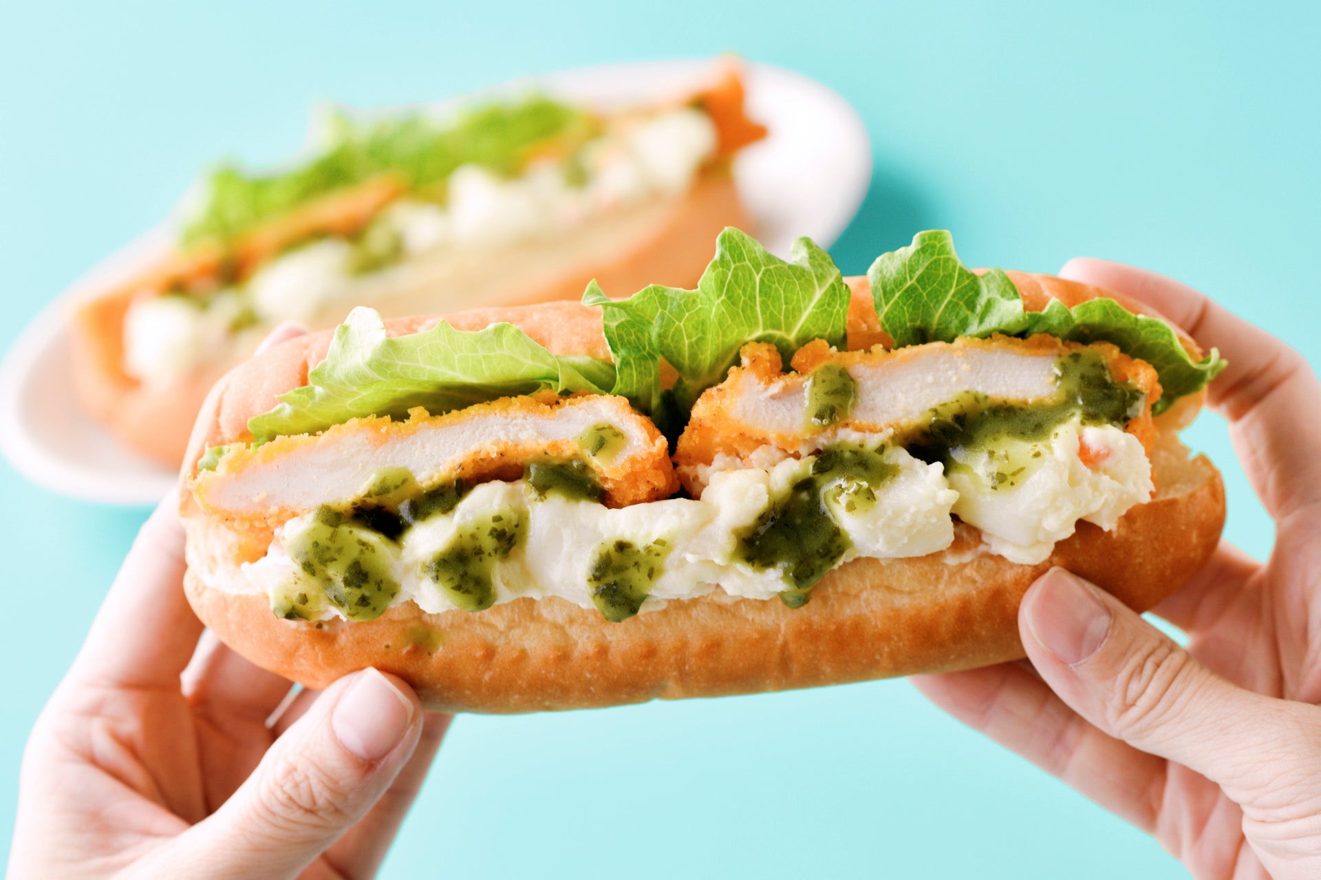 バジルの香りが広がるポテトサラダと、ジューシーなチキンフィレが絶妙にマッチするボリューム感のあるサンドです。酸味が効いたバジルソースが食欲をそそります。ぜひ、ご賞味ください。