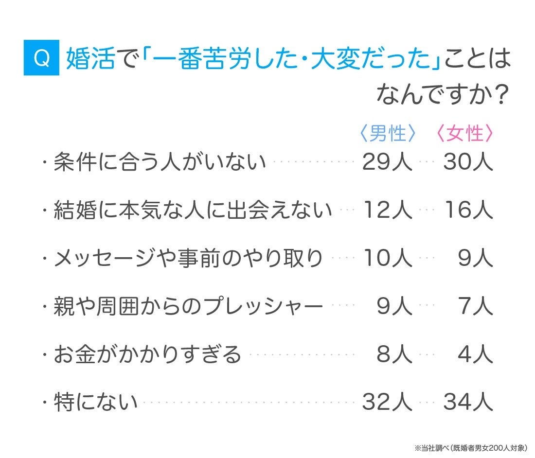 既婚者の男女200人に「婚活で一番苦労した・大変だったことは何ですか?」と尋ねました。