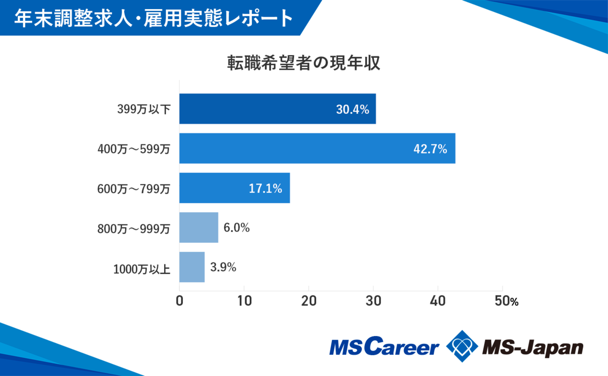 年末調整業務の経験がある転職希望者の現年収の平均は495万円でした。最も割合の多い年収帯は、求人と同様に「400~599万」で42.7%を占めていました。