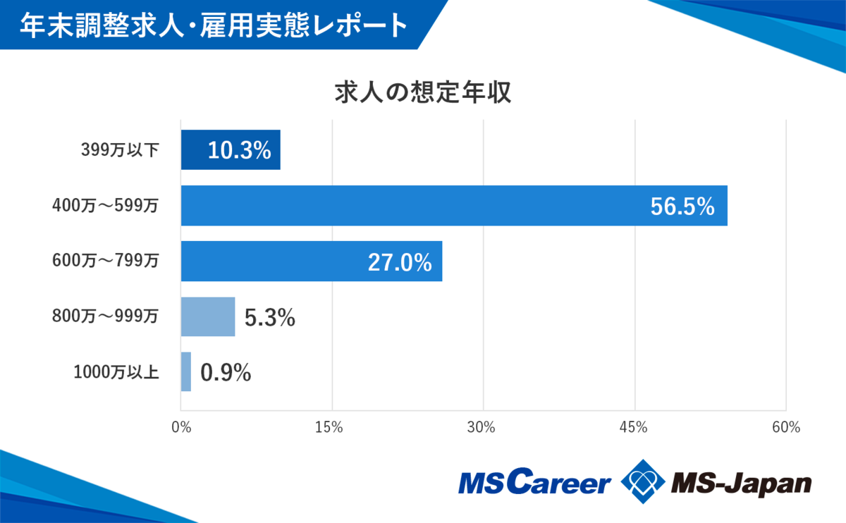 業務に年末調整が含まれる求人の想定年収を見てみましょう。想定年収の平均は539万円でした。2021年10月~2022年9月のデータの513万円と比較すると、26万円増加していることが分かりました。また、最も割合が多い年収帯は「400~599万」の56.5%と半数以上を占めていました。