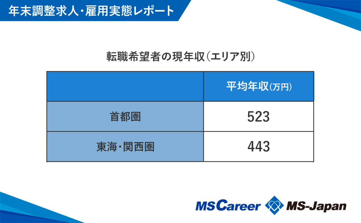 エリア別で見ると、首都圏は523万円、東海・関西圏は443万円と80万円の差がありました。一般的に首都圏の方が平均年収は高いと言われていますが、年末調整業務の経験がある転職希望者においても同様の傾向が見られました。