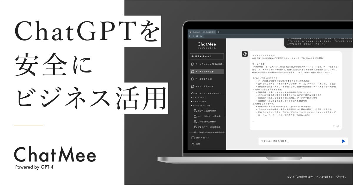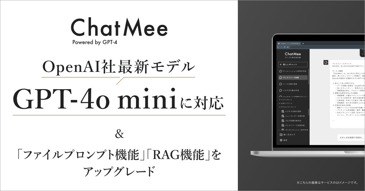 株式会社AVILEN(本社:東京都中央区、代表取締役:高橋 光太郎、以下「AVILEN」)は法人向けChatGPT活用プラットフォーム「ChatMee」をOpenAIの最新生成AIモデル「GPT-4o mini」に対応させ、機能をアップグレードしたことをお知らせいたします。