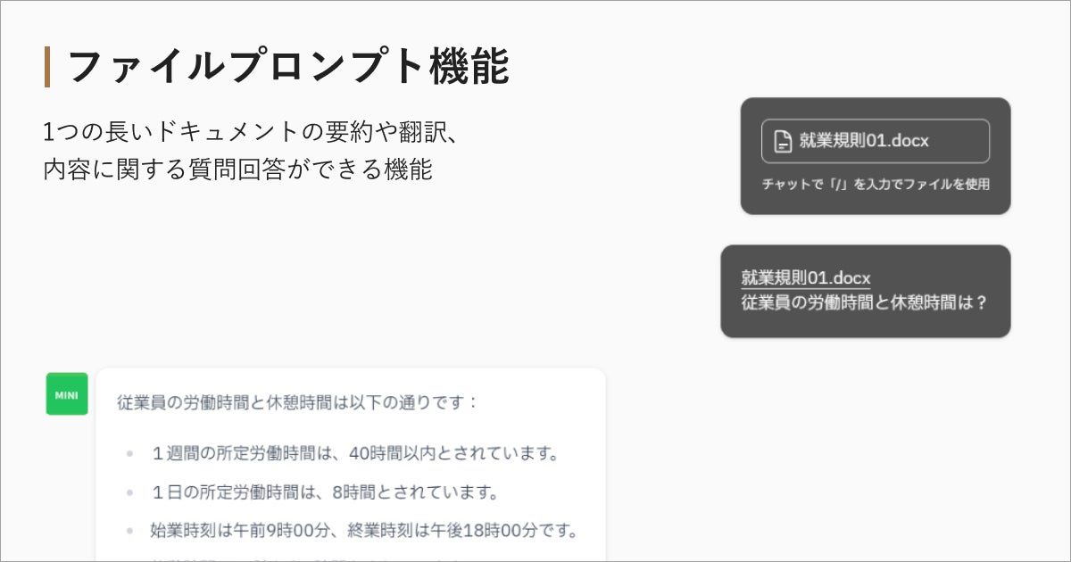 GPT-4o mini対応のアップデートにより、機能面でアップグレードを実現しています。アップロードしたファイルを参照できる「ファイルプロンプト機能」の回答精度が大幅に向上しています。